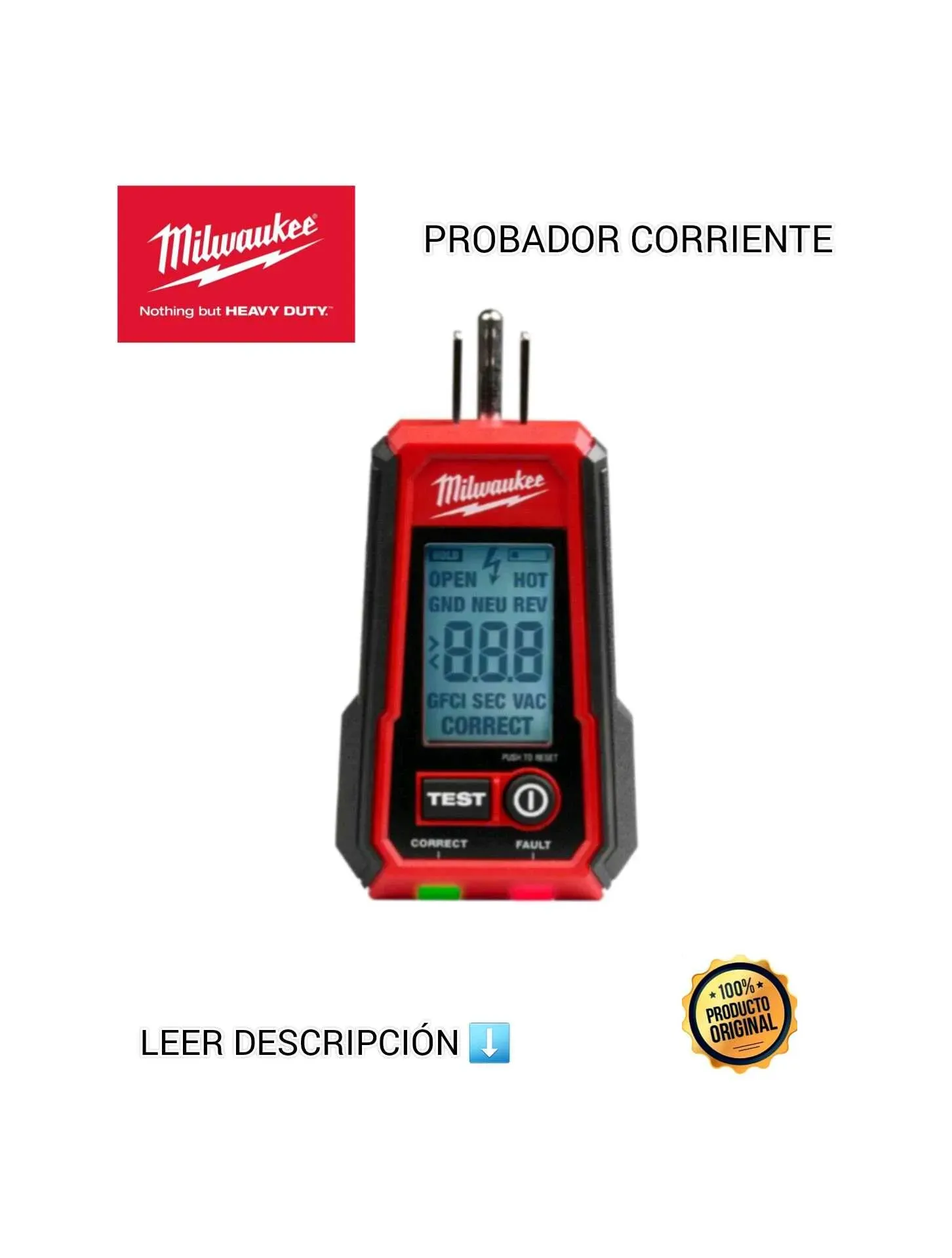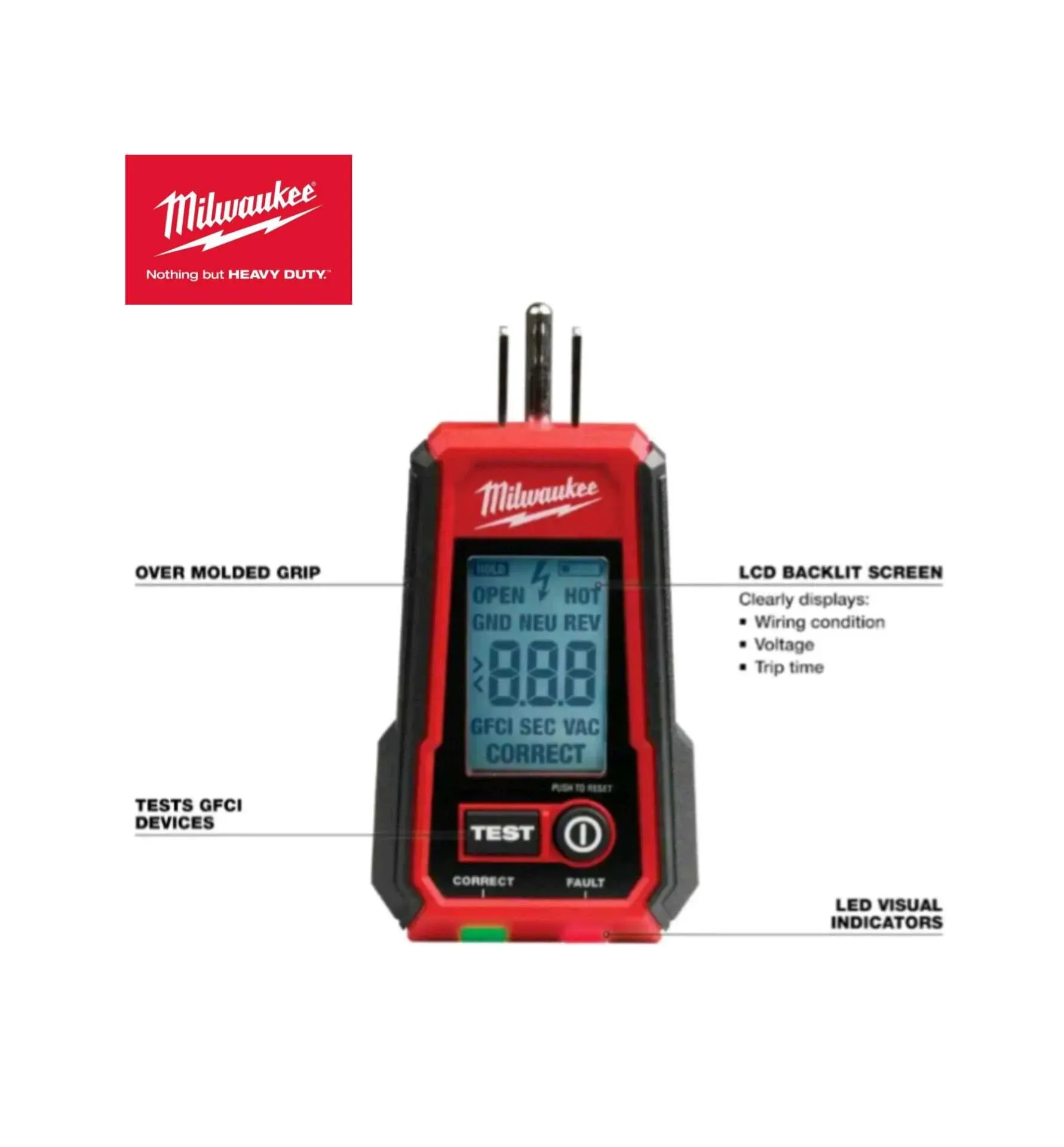 El comprobador digital de toma corrientes GFCI de Milwaukee está diseñado para reducir el riesgo de descarga eléctrica generada por los toma corrientes.