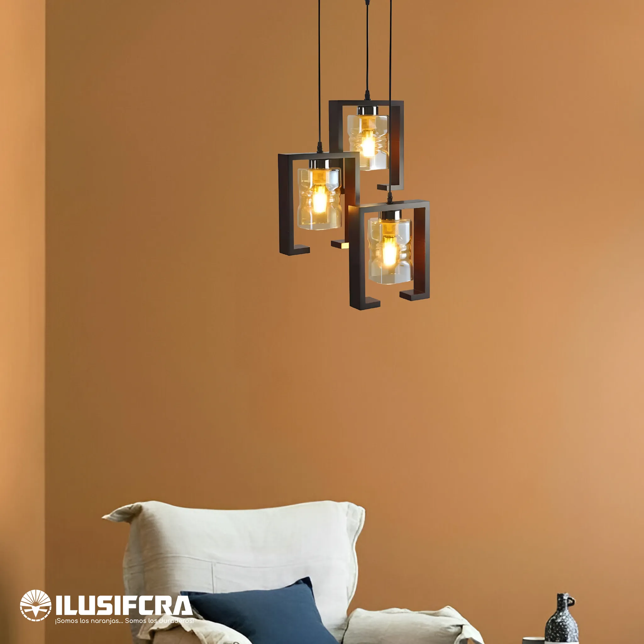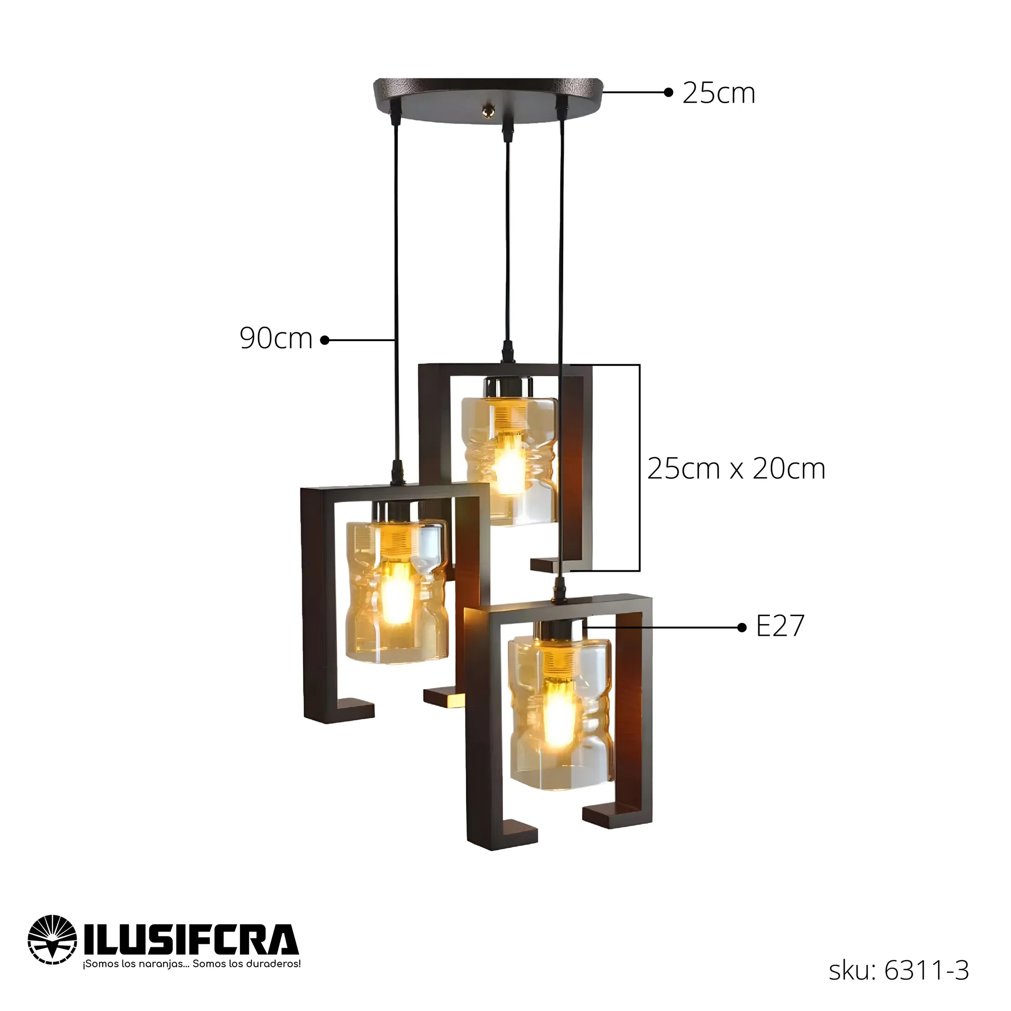 LÁMPARA DE COLGAR RÚSTICA MADERA + 3 COPAS DE VIDRIO 6311-3