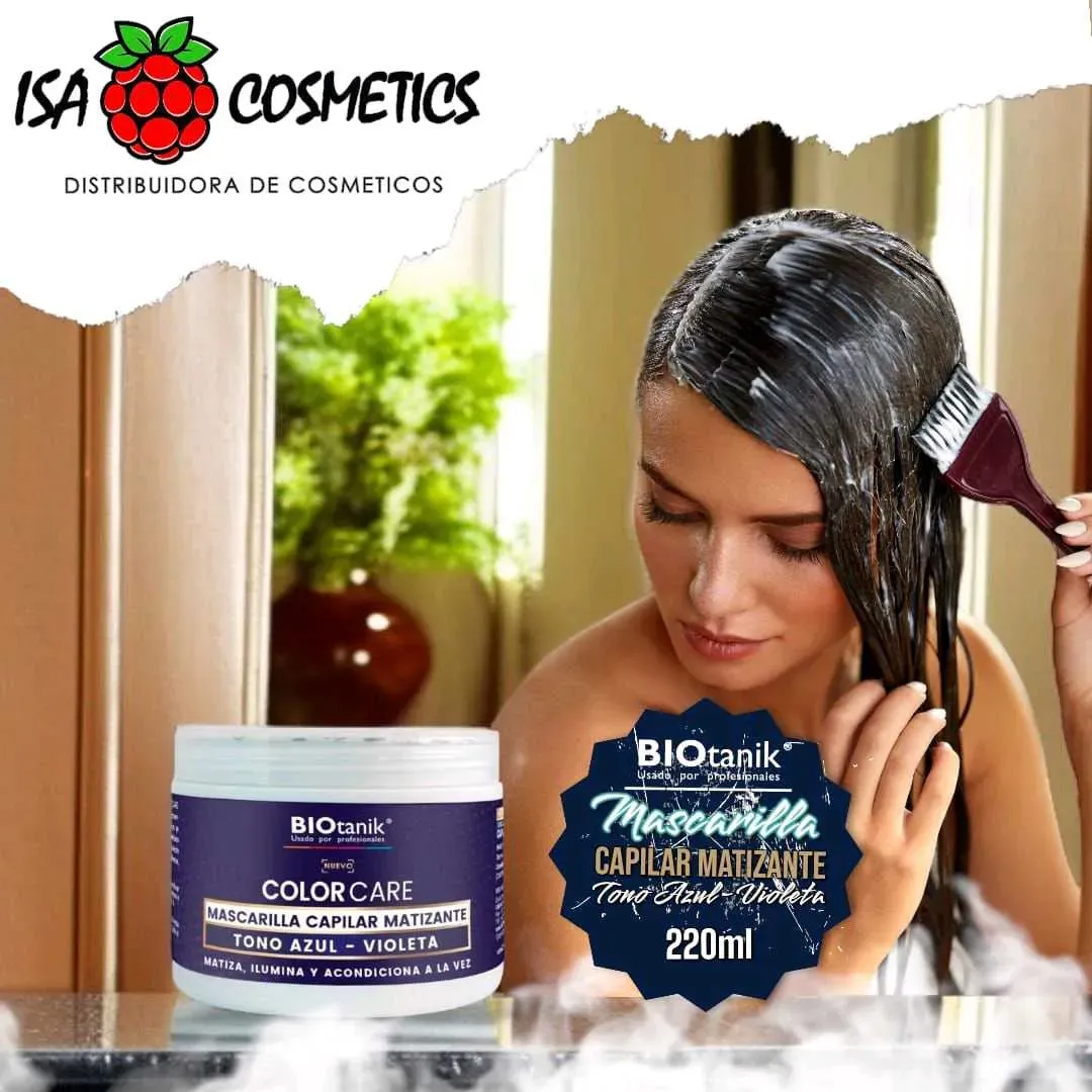La Mascarilla Matizante Azul-Violeta Biotanik 220ML neutraliza los tonos cálidos y reaviva el color como recién salido del salón.