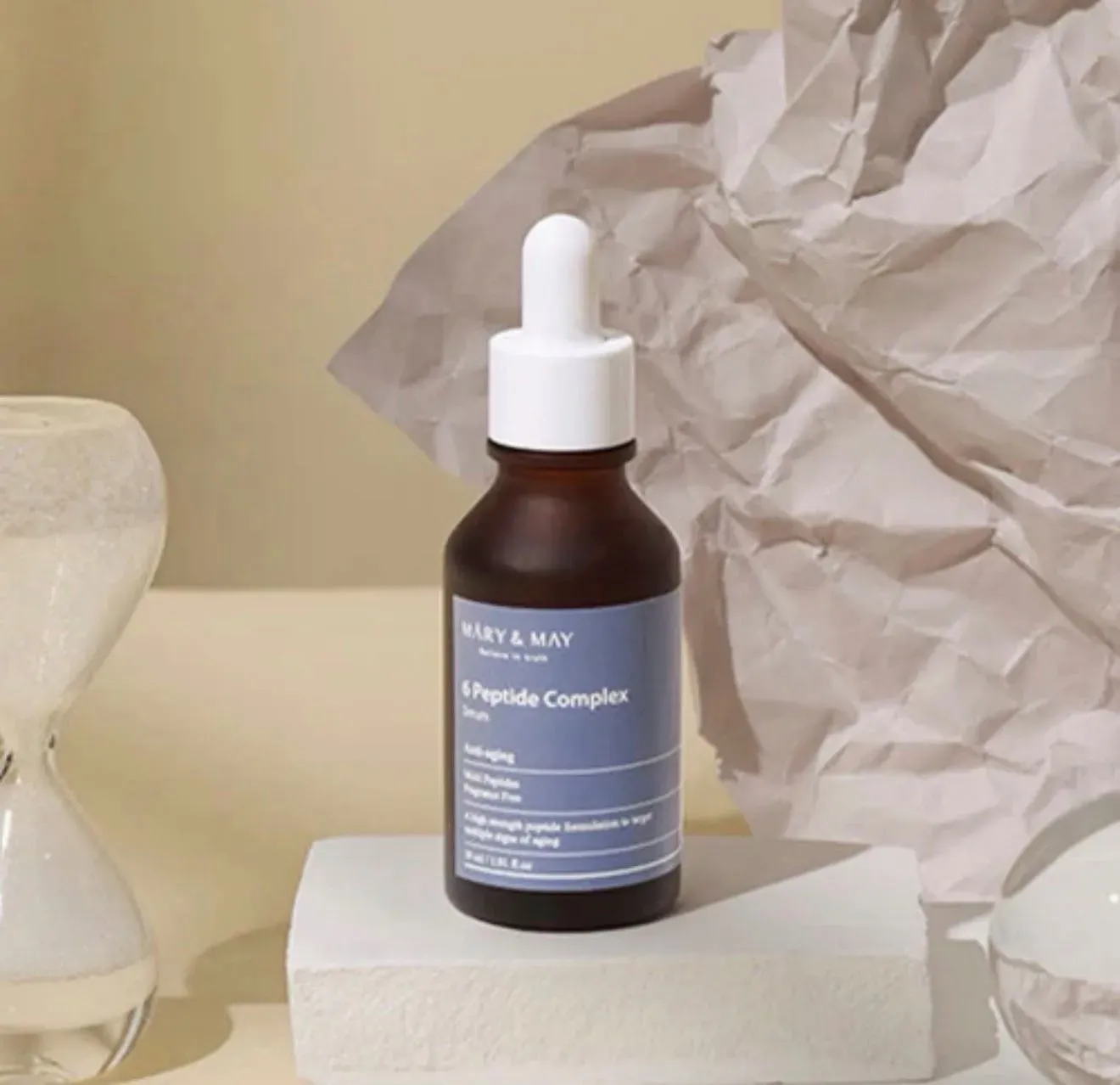 Mary & May 6 Peptides Complex Serum es un lifting fuerte con ingredientes de péptidos, un antienvejecimiento básico. El péptido es una materia prima segura y eficaz porque tiene el efecto de aliviar las arrugas sin causar sequedad en la piel.