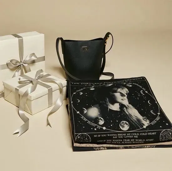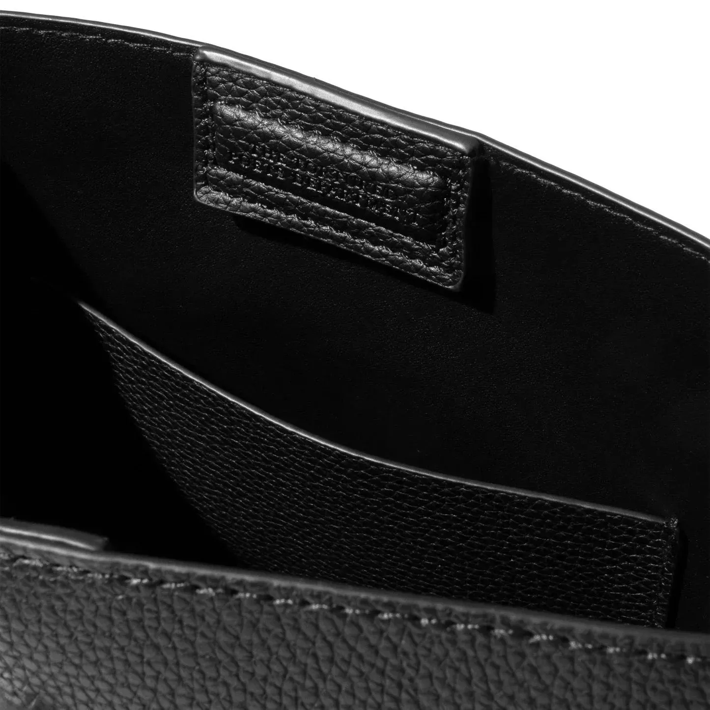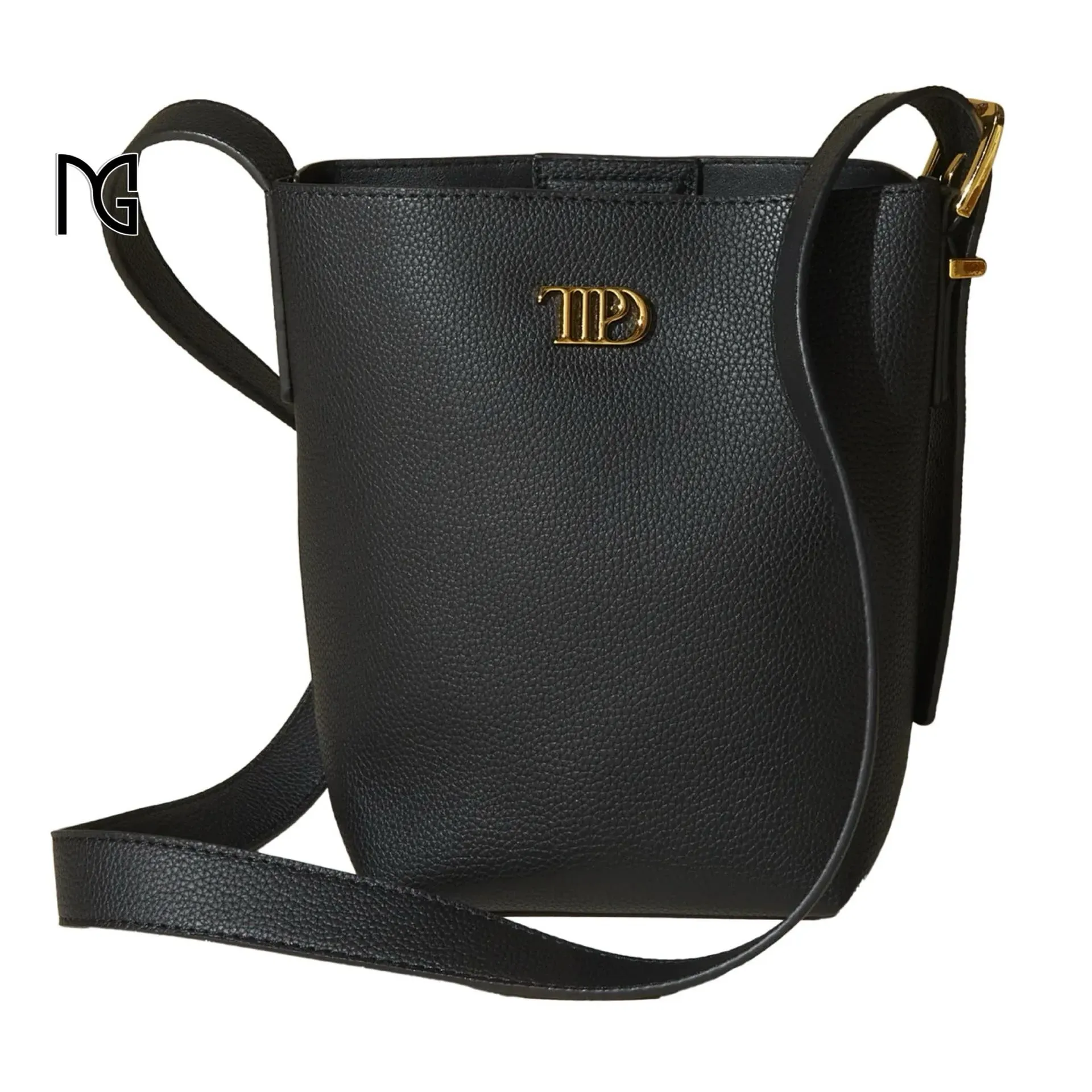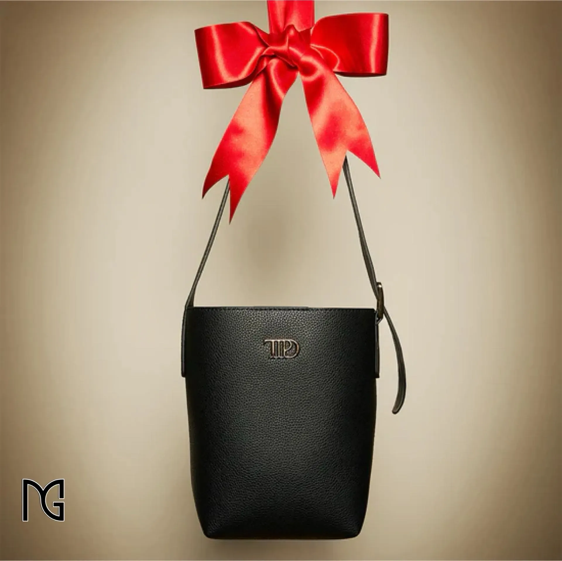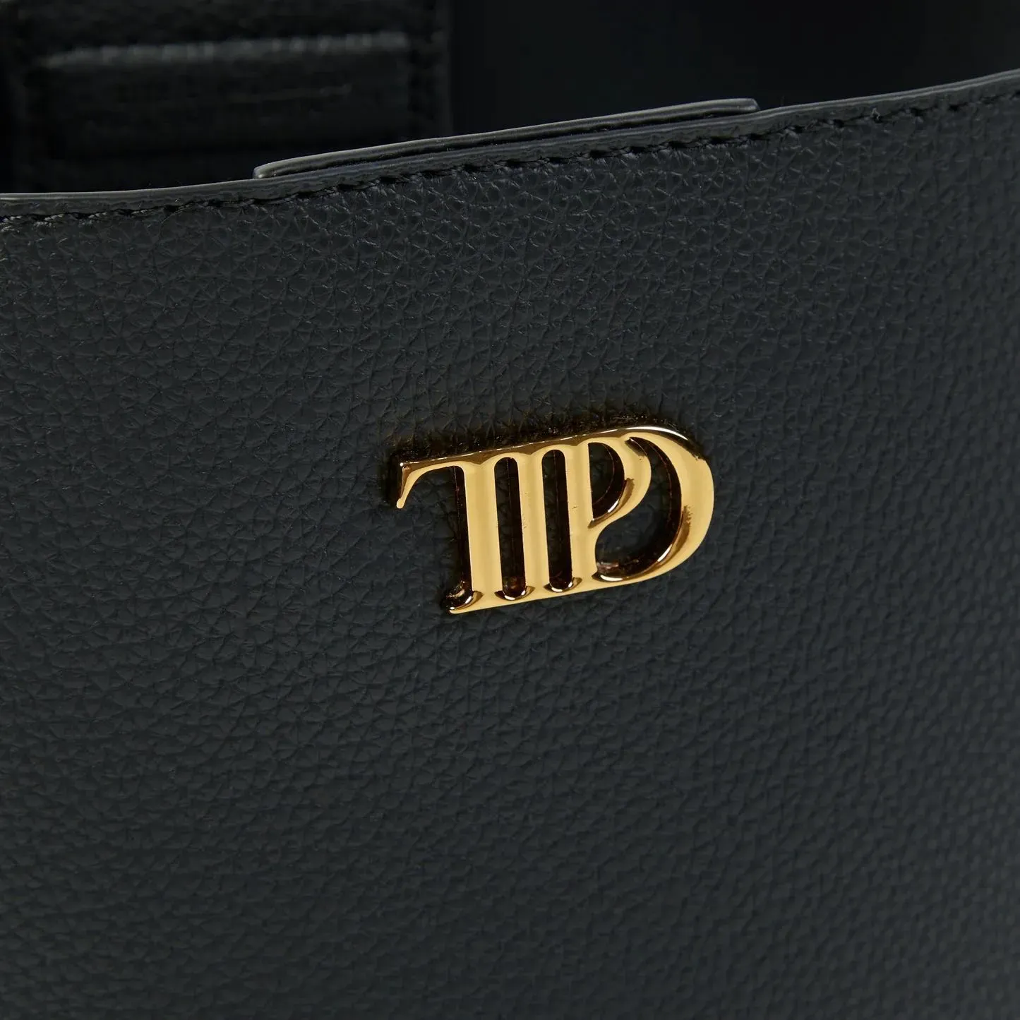 Bolso de piel sintética negro con herrajes de metal dorado TTPD en la parte delantera y hebilla de metal dorado en la correa ajustable con cierre magnético.