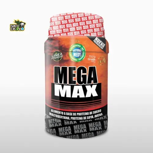 Mega Max (Proteína), alimento a base de Proteína de Suero, Maltodextrina, Proteína de Soya y Avena. Carbohidratos de alto índice glicémico. Buena fuente de proteínas. Vitaminas y Minerales. Ideal para deportistas que deseen aumentar, definir su potencia y masa muscular.