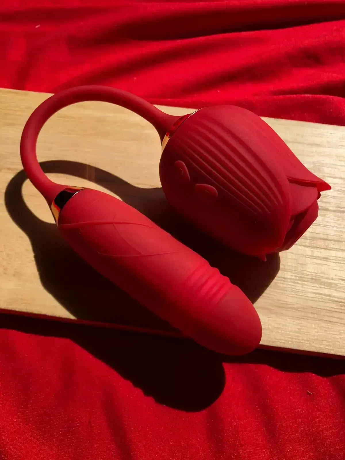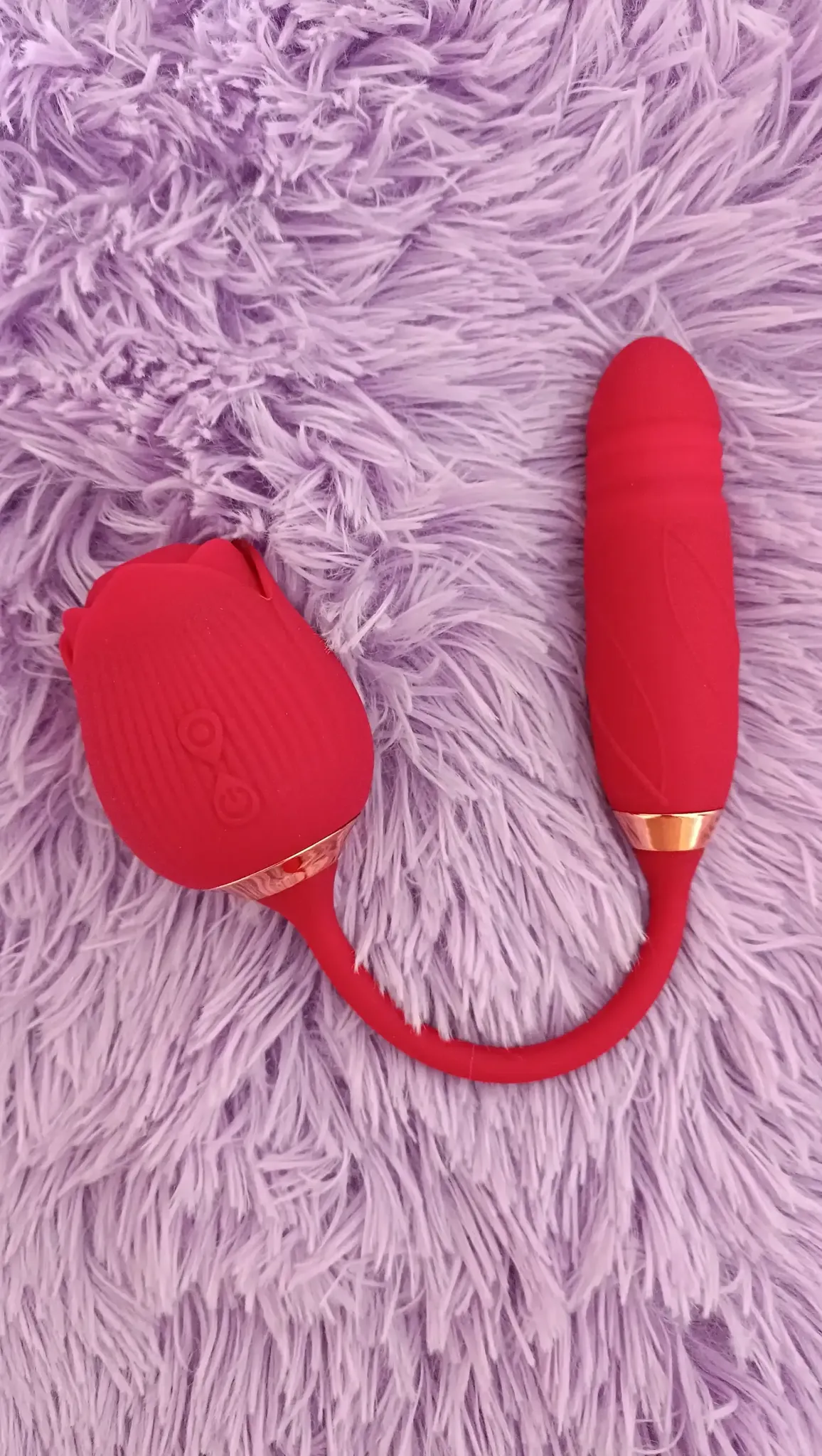 Está hermosa rosa es succionadora con 10 modos de succión y vibrador con movimiento telescopico para tener doble estimulacion que te encantara.