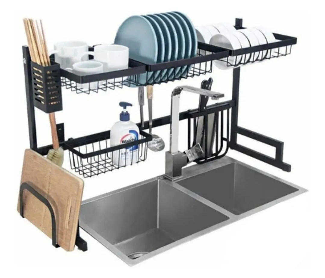 Escurridor de cubiertos de metal, importados, totalmente desmontables. Cuenta con 3 canastas arriba, porta picador, porta cuchillos grandes, otro para cuchara, tenedor y cuchillos, porta esponjas.