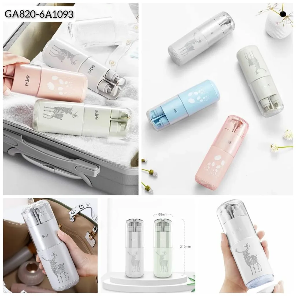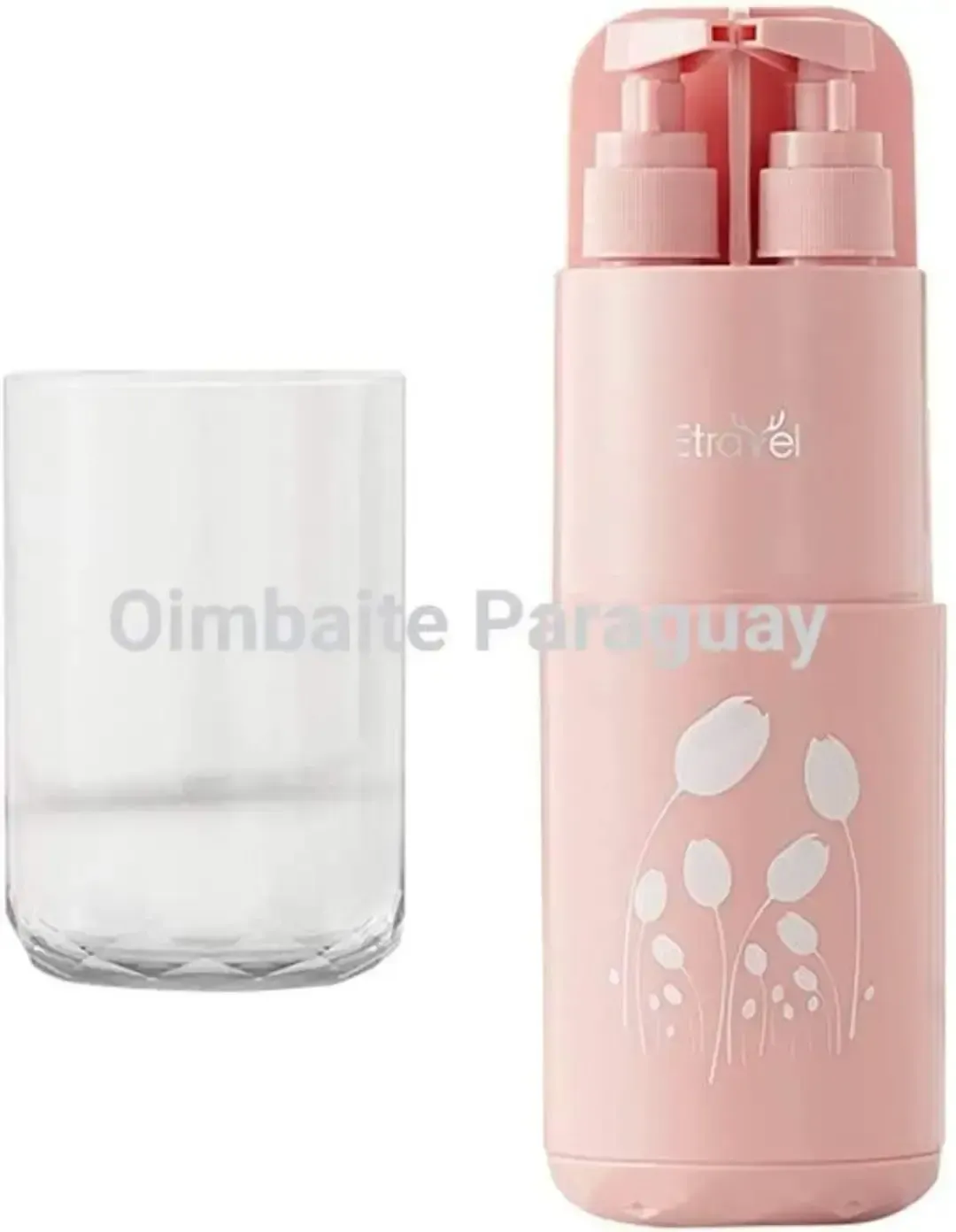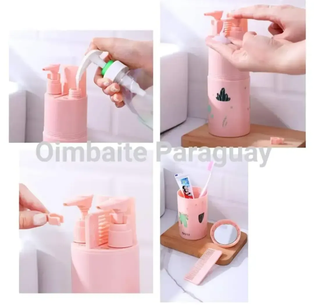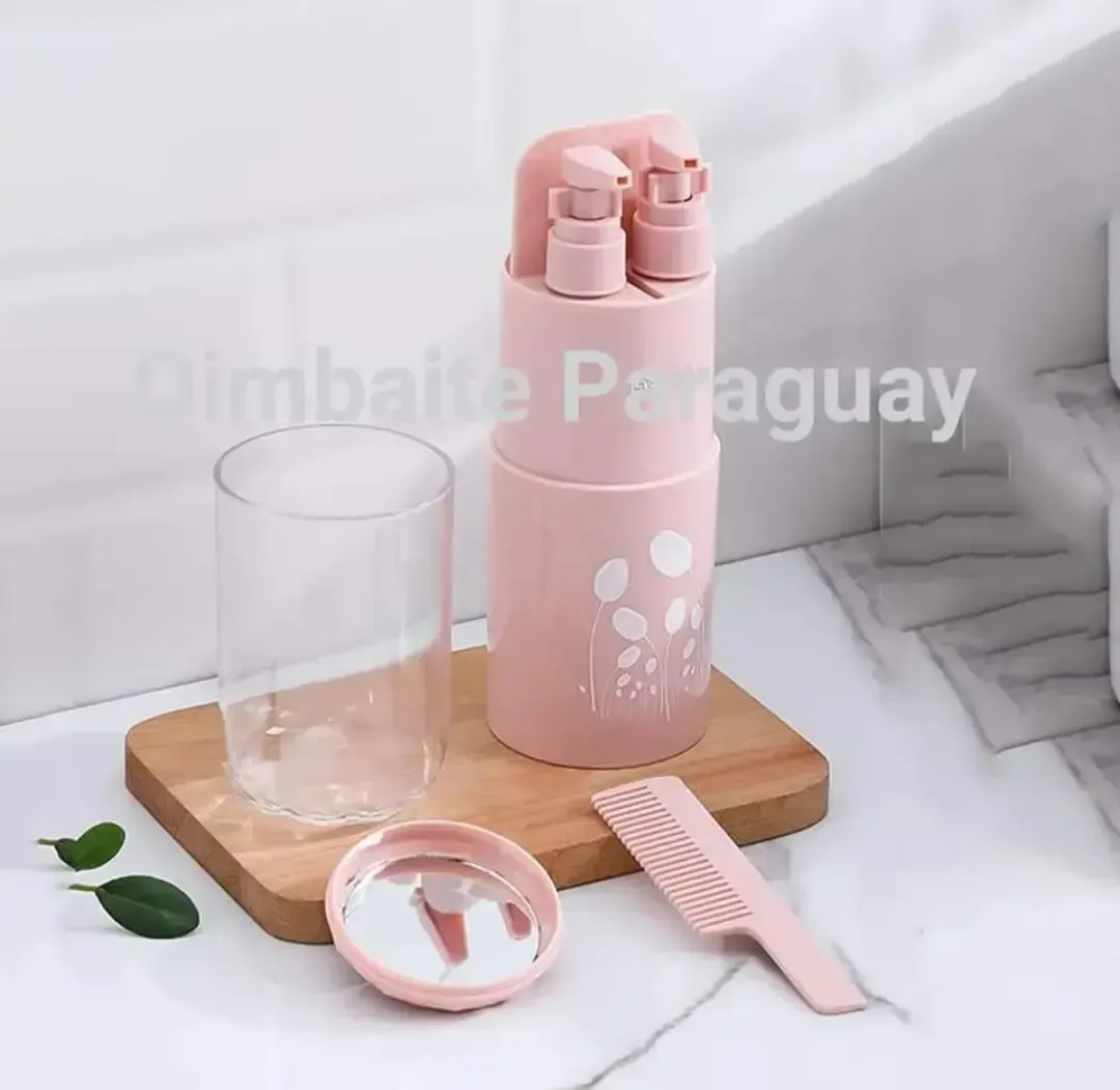 Kit de limpieza personal, especial para viajes, posee 2 envases dispensadores para cargar tu shampoo y enjuague, jabón líquido o alcohol. También podés agregar cepillo de dientes, crema dental, peine y toallita.