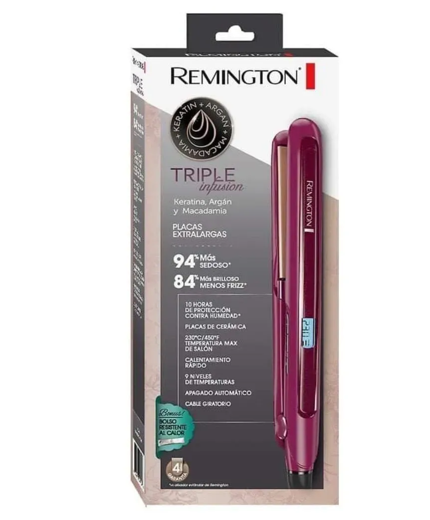 Puedes lograr un estilo elegante,liso y duradero en casa con la plancha de cabello Triple Infusión de Remintong.cuenta con microacondicionadores de Keratina para un n cabello saludable y fuerte,Aceite de Argan para reducir el Frizz y aportar brillo,