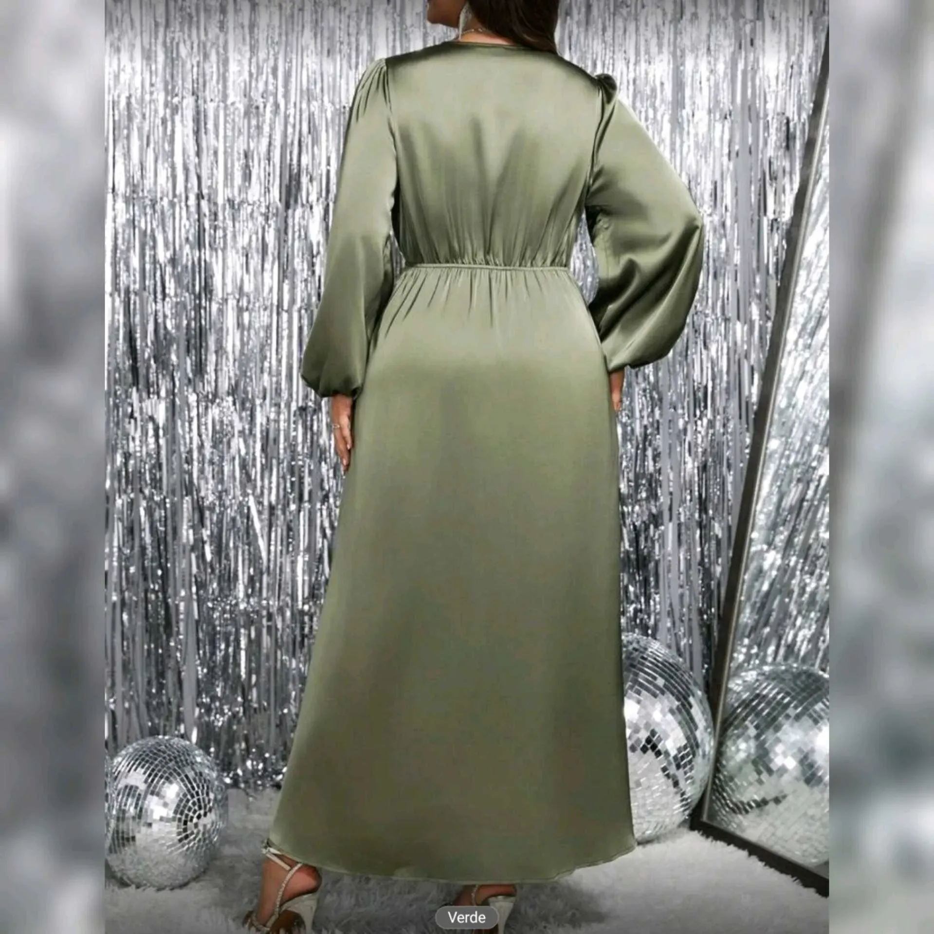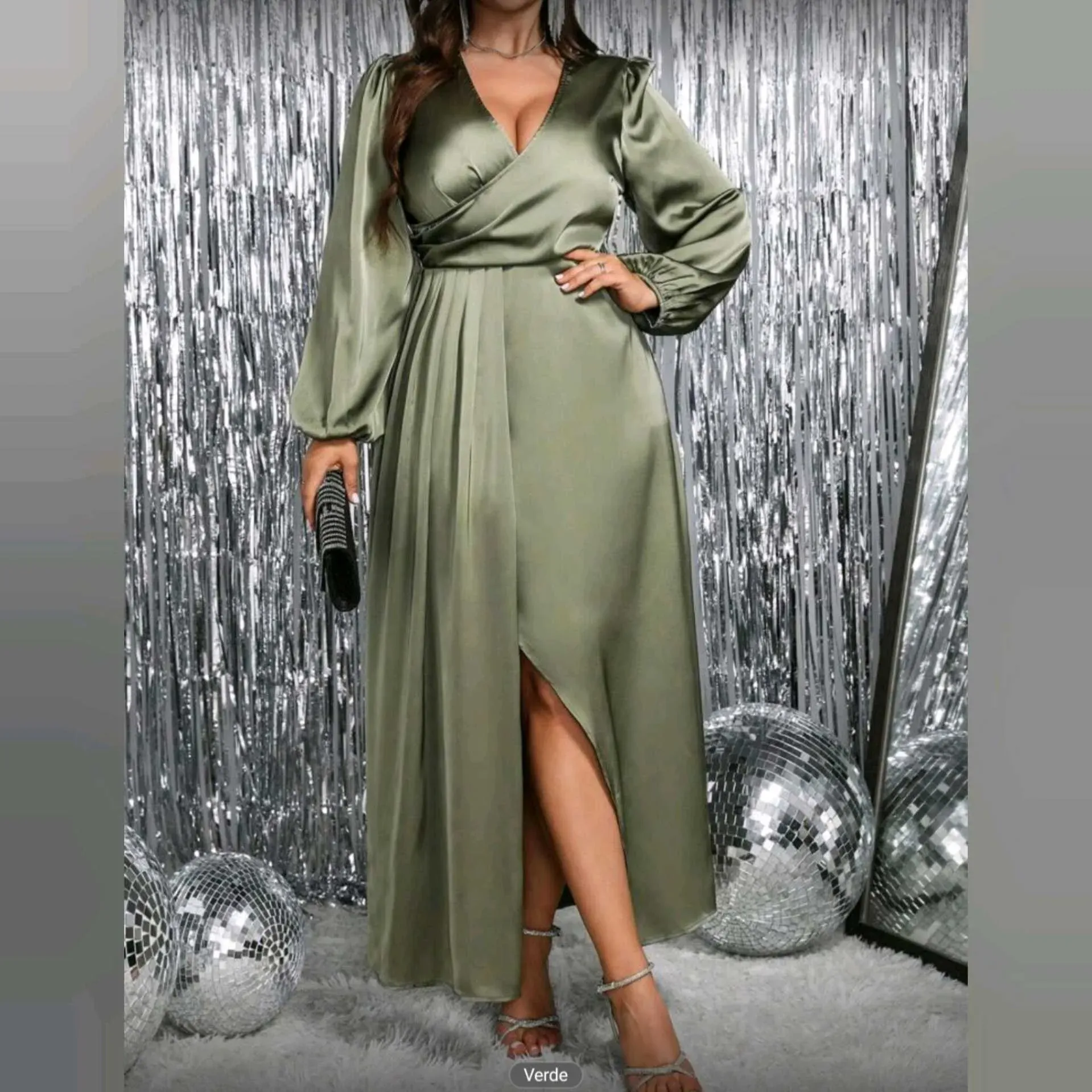 💚 Vestido Celure Satinado Curvy – Elegancia que Resalta tu FiguraBrilla con confianza en cada evento ✨Este vestido de satén Celure está diseñado para realzar las curvas con un ajuste sofisticado y femenino.Cuenta con un escote cruzado en V, mangas farol