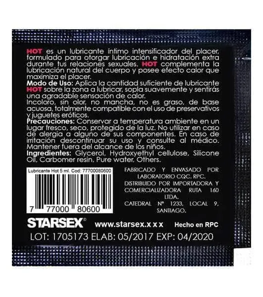 Si quieres una experiencia sexual única, el Lubricante Hot con efecto calores para ti. Gracias a su increíble textura y efecto calor, intensifica el placer y aumenta la estimulación sexual. Con su formato sachet lo podrás llevar a cualquier lugar, incluso en tu billetera para estar preparado en cual...