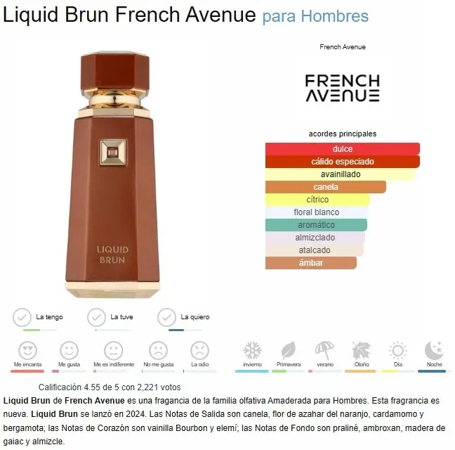 Liquid Brun de French Avenue es una fragancia de la familia olfativa Amaderada para Hombres. Esta fragrancia es nueva. Liquid Brun se lanzó en 2024. Las Notas de Salida son canela, flor de azahar del naranjo, cardamomo y bergamota; las Notas de Corazón son vai...
