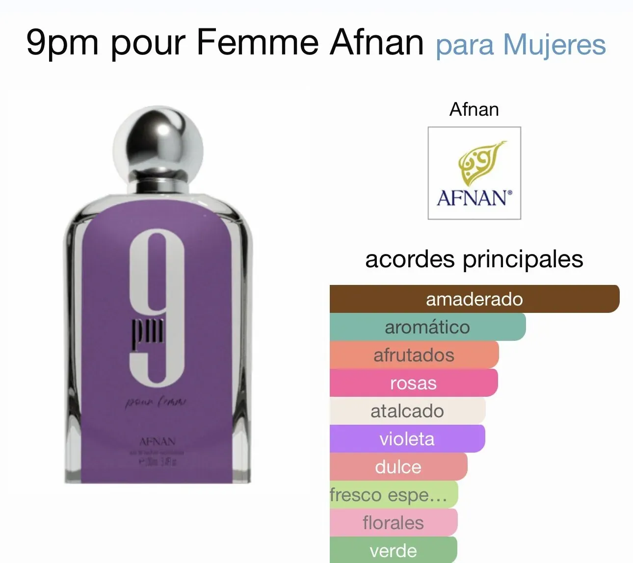 9PM POUR FEMME Afnan 100ml... Las notas superiores son flor de naranja, ralladura de limón y frambuesa; las notas medias son tuberosa, naranja mandarina, jazmín y ambroxano; las notas base son almizcle, notas de madera y sambac de jazmín.