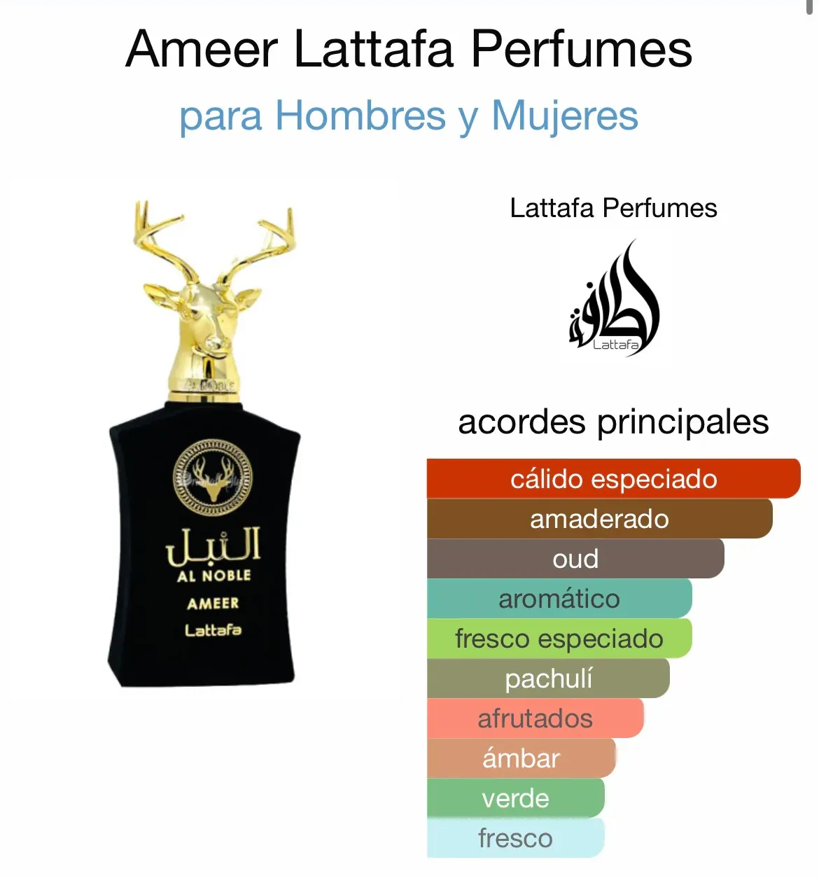 Perfume AL NOBLE AMEER de Lattafa Unisex decant de 5ml. Notas de salida : Coctel de frutas, piña Notas medias : Vainilla, hierba seca Notas de fondo : almizcle, madera de cedro Si te gustan perfumes como 5 de Rosendo Mate es muy probable que te guste éste perfume .