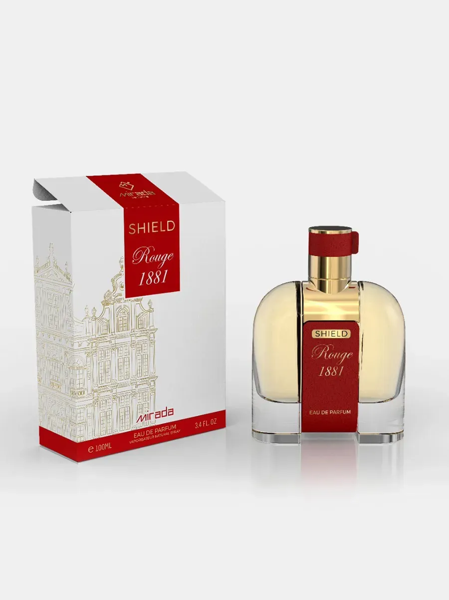 Una botella de cristal transparente cubierta con una lujosa correa carmesí, creando una elaborada obra de arte con el nombre de Shield Rouge 1881. Este carismático Eau de Parfum ha sido diseñado para acariciar la piel con una fusión de aroma floral picante, que luego madura lentamente hasta que term...