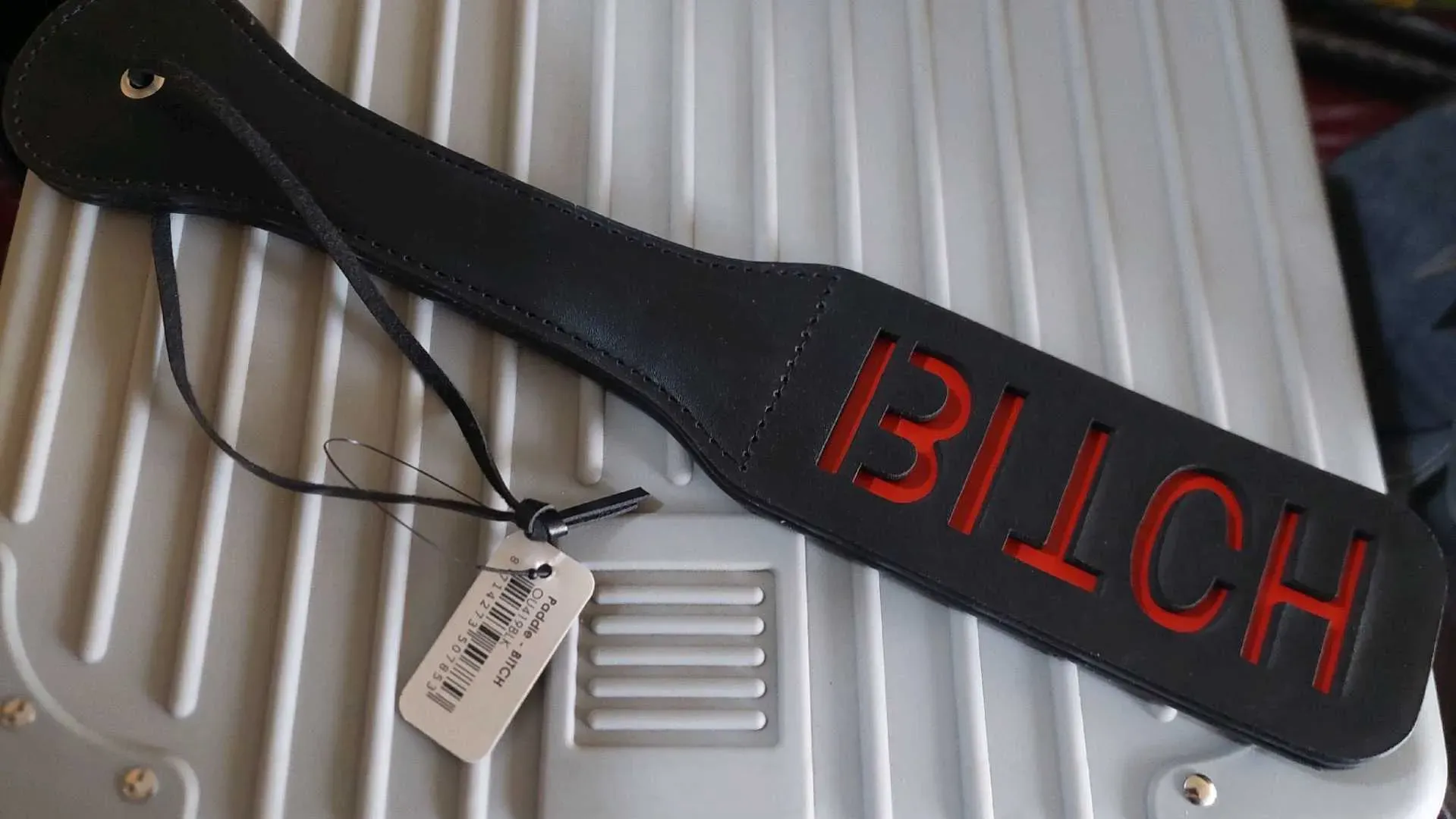 Deja una impresión duradera en sus recuerdos con este azotador BDSM. La palabra BITCH se invierte para que aparezca en su piel. Hecho de cuero cosido firme pero flexible.