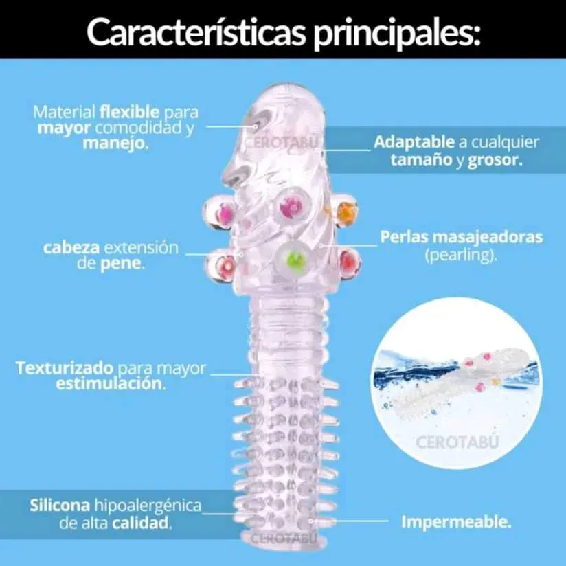 Esta extensión- funda para el pene fabricada en silicona, le agregará unos centímetros de grosor y largo a tu pene, haciéndolo más imponente en el momento de la penetración.