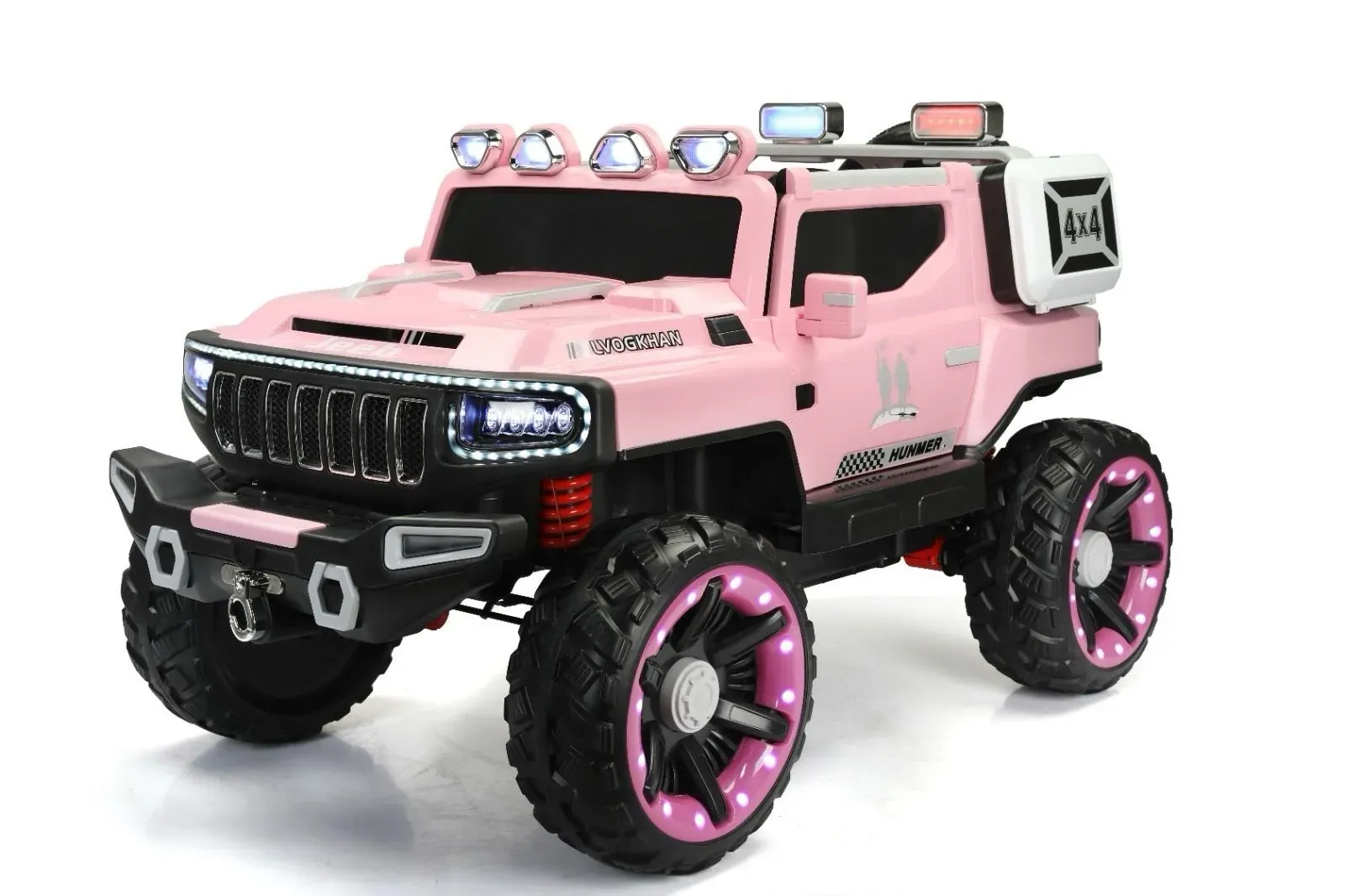 Carro electrico 4X4 para ninas 12V10A, lo pueden manejar con el teléfono los padres por medio de app, también por control remoto o el niño, luces, sonidos, mecedora, musica, USB, bluetooth, colores rosado, rojo y gris, un año de garantia, precio ₡260000.