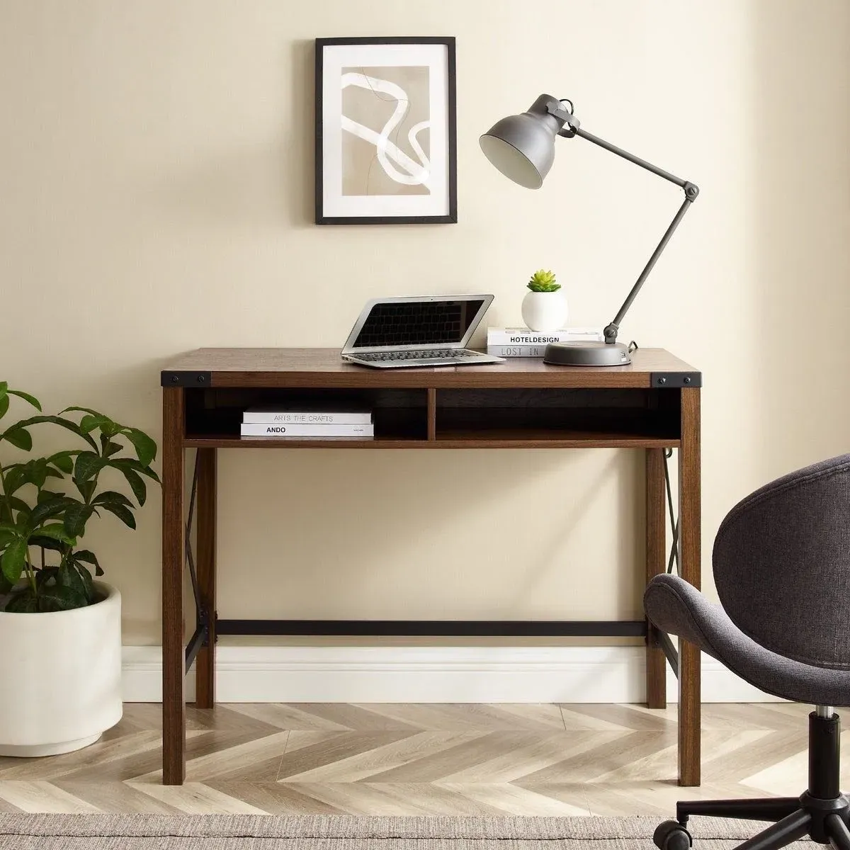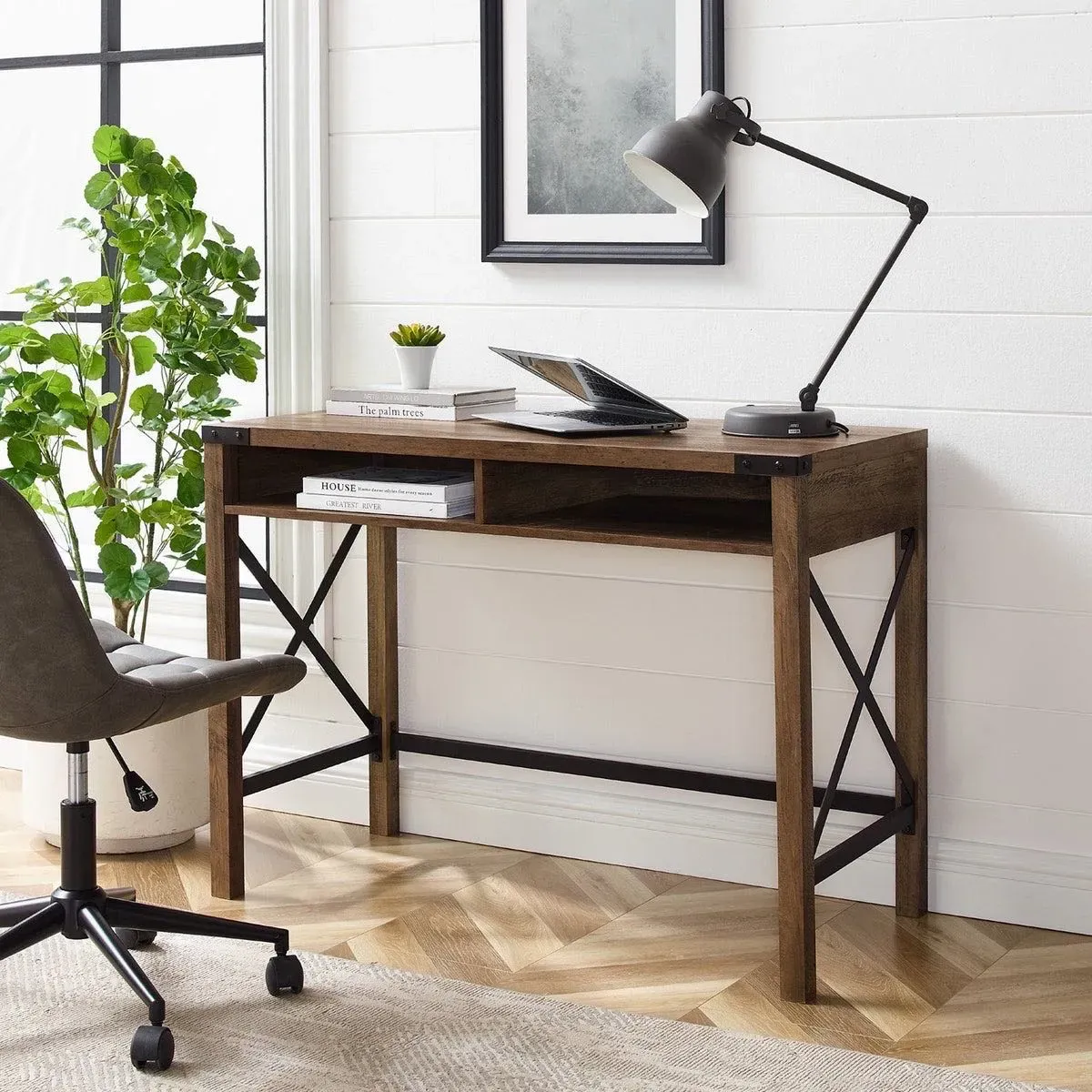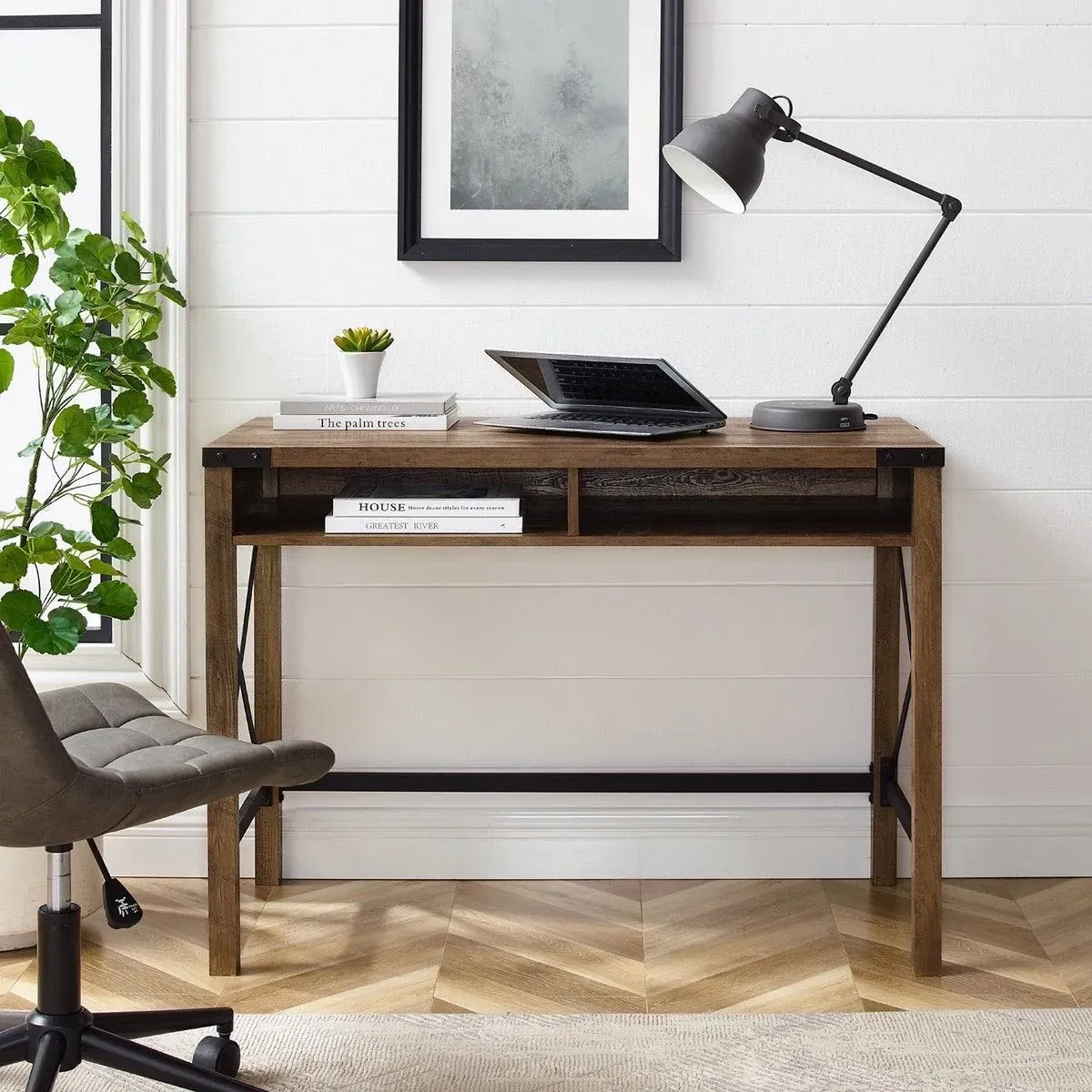Haz más cosas con este escritorio rústico de madera y metal. La sencilla superficie de este escritorio rústico es un lugar ideal para planificar tu agenda, terminar la tarea o trabajar en una computadora. También es un gran lugar para guardar dispositivos electrónicos gracias a los dos compartimento...