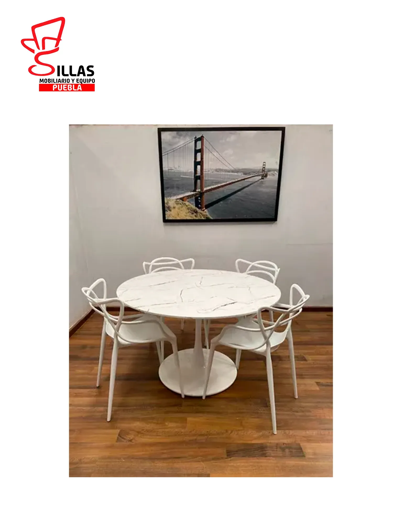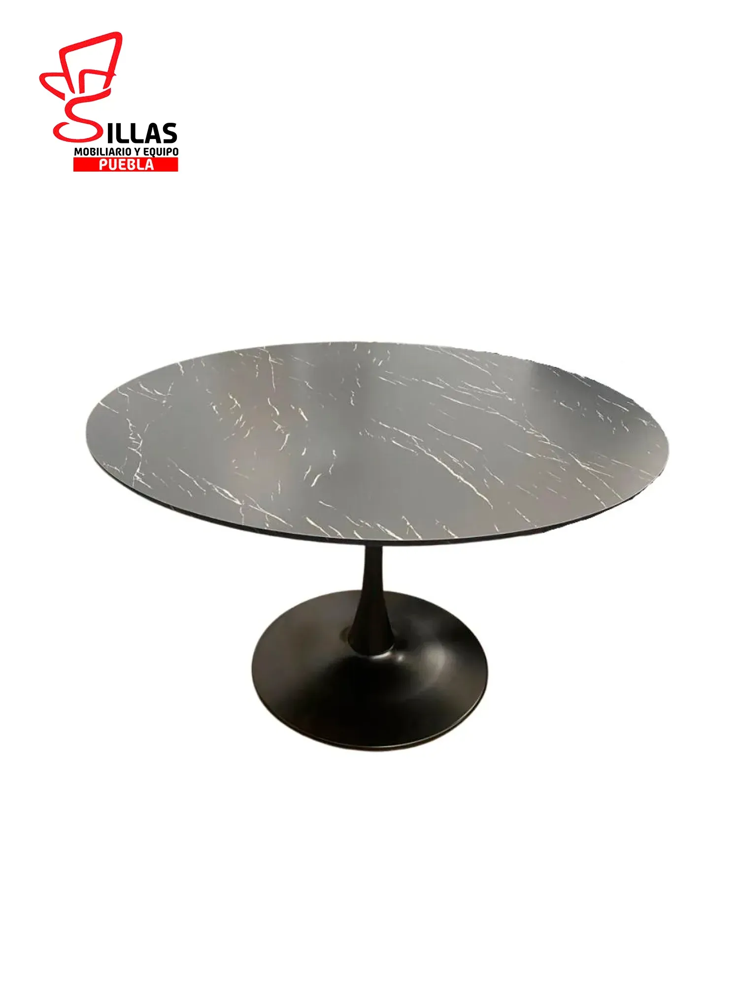 Fabricada en cubierta de MDF de 19 MM / Impresión tipo Mármol color Negro y Blanco acabado mate / Base de lámina redonda en pintura electrostática / Resbalón de Hule