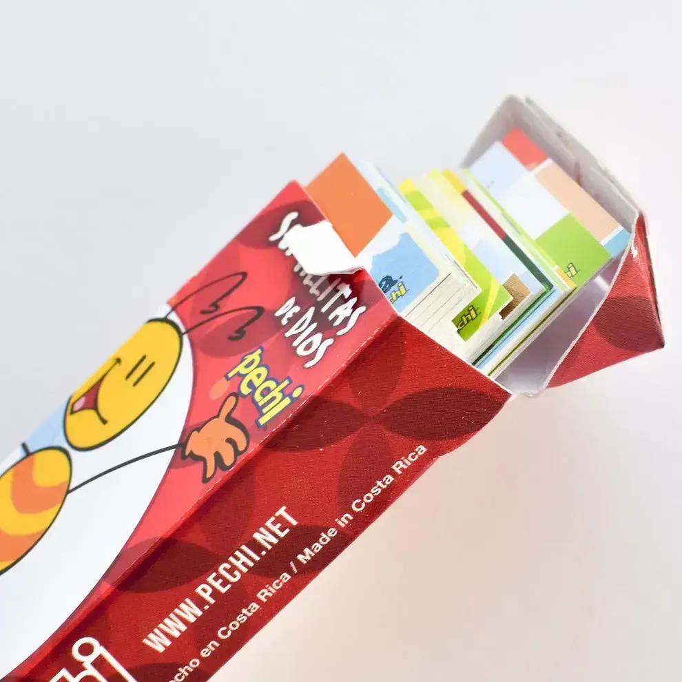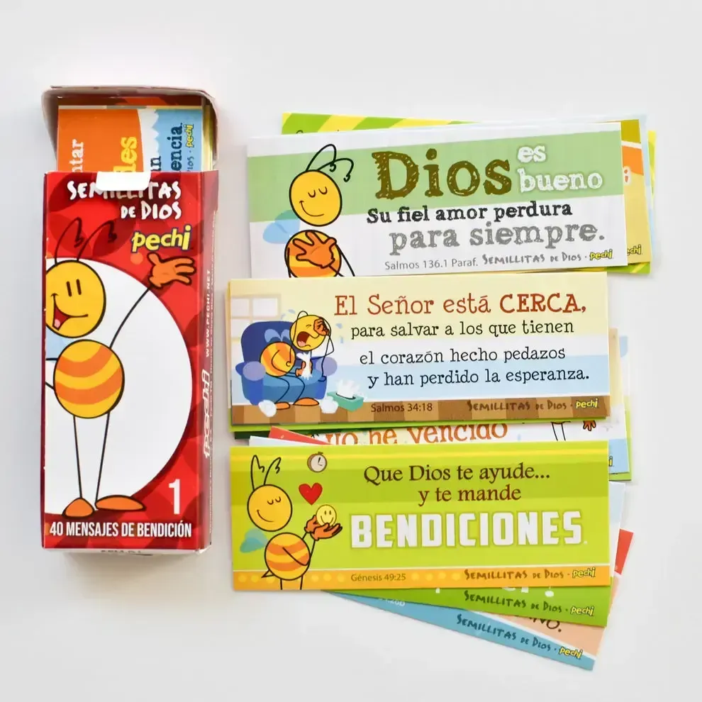 Cada cajita trae 40 tarjetitas diferentes, todos con versículos bíblicos hermosos, que cae como una semillita a nuestros corazones necesitados de esa palabra divina. Mide 8.2 cm de ancho por 3.1 cm de alto, viene empacado de bolsita con hueco para colgar.