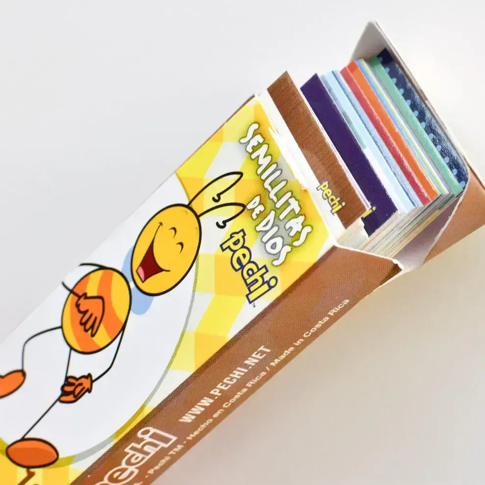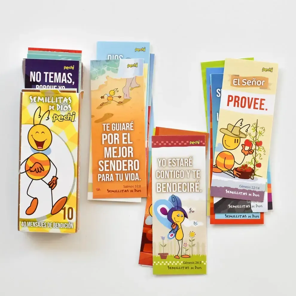 Cada cajita trae 40 tarjetitas diferentes, todos con versículos bíblicos hermosos, que cae como una semillita a nuestros corazones necesitados de esa palabra divina. Mide 8.2 cm de ancho por 3.1 cm de alto, viene empacado de bolsita con hueco para colgar.