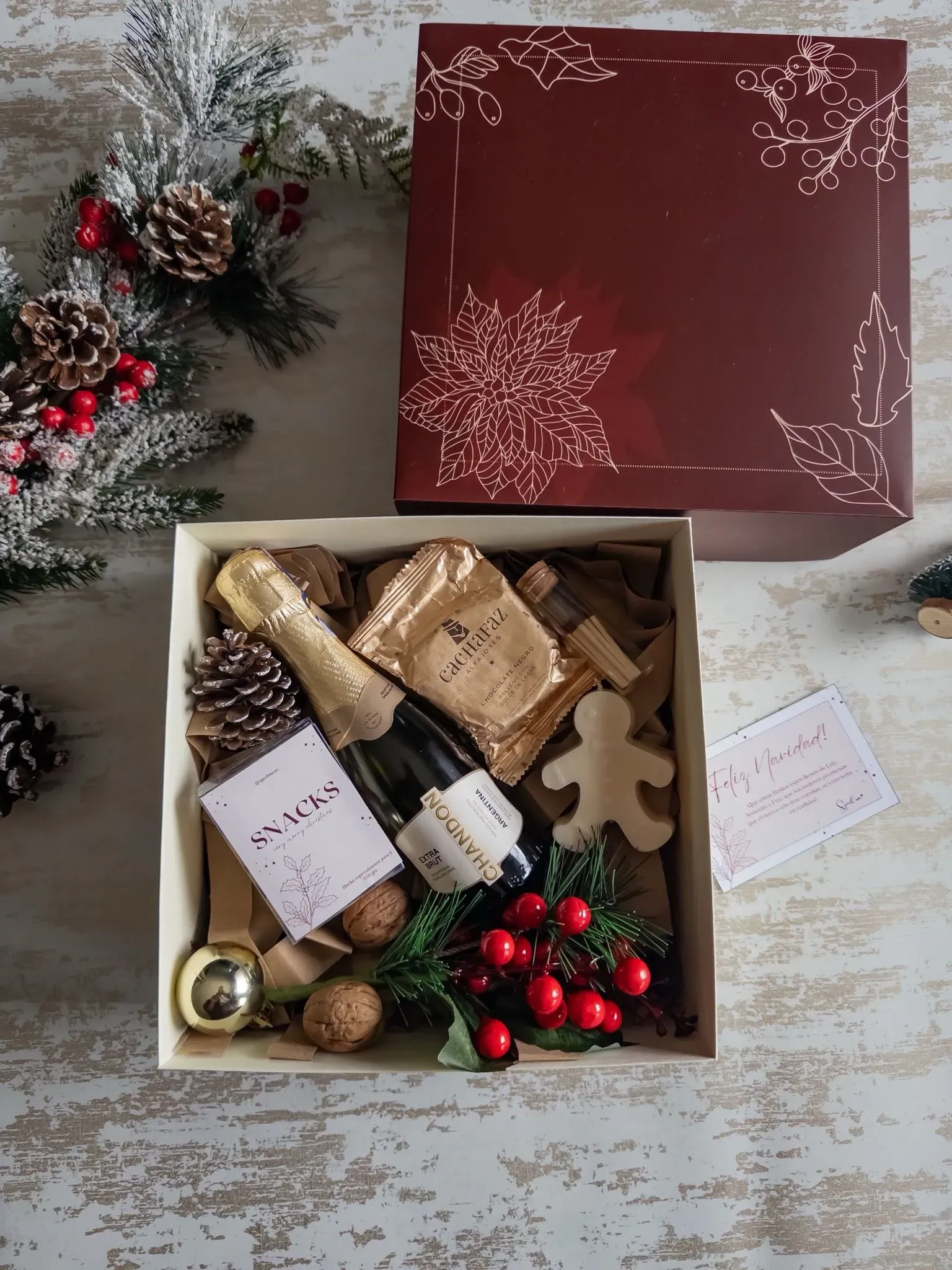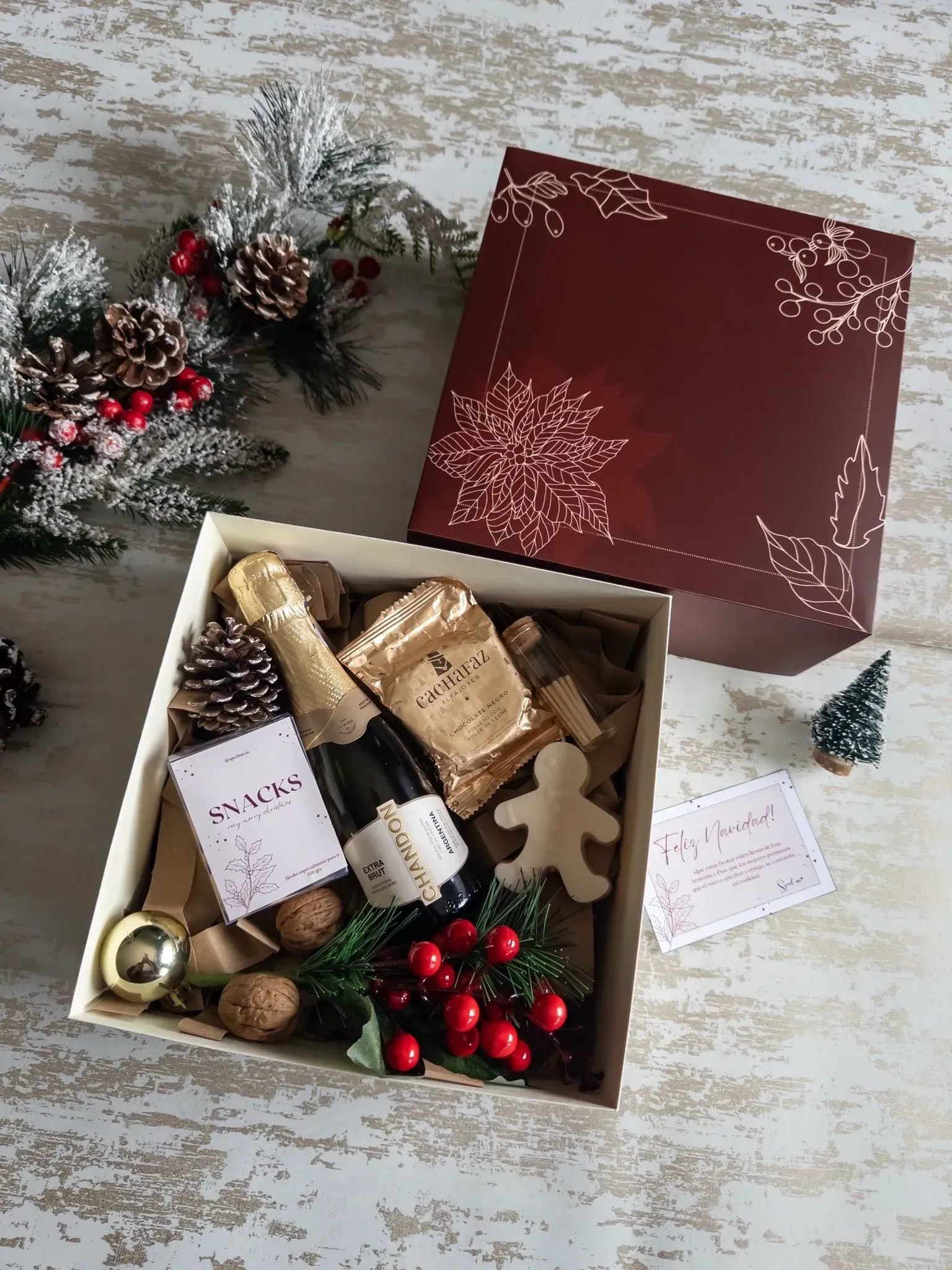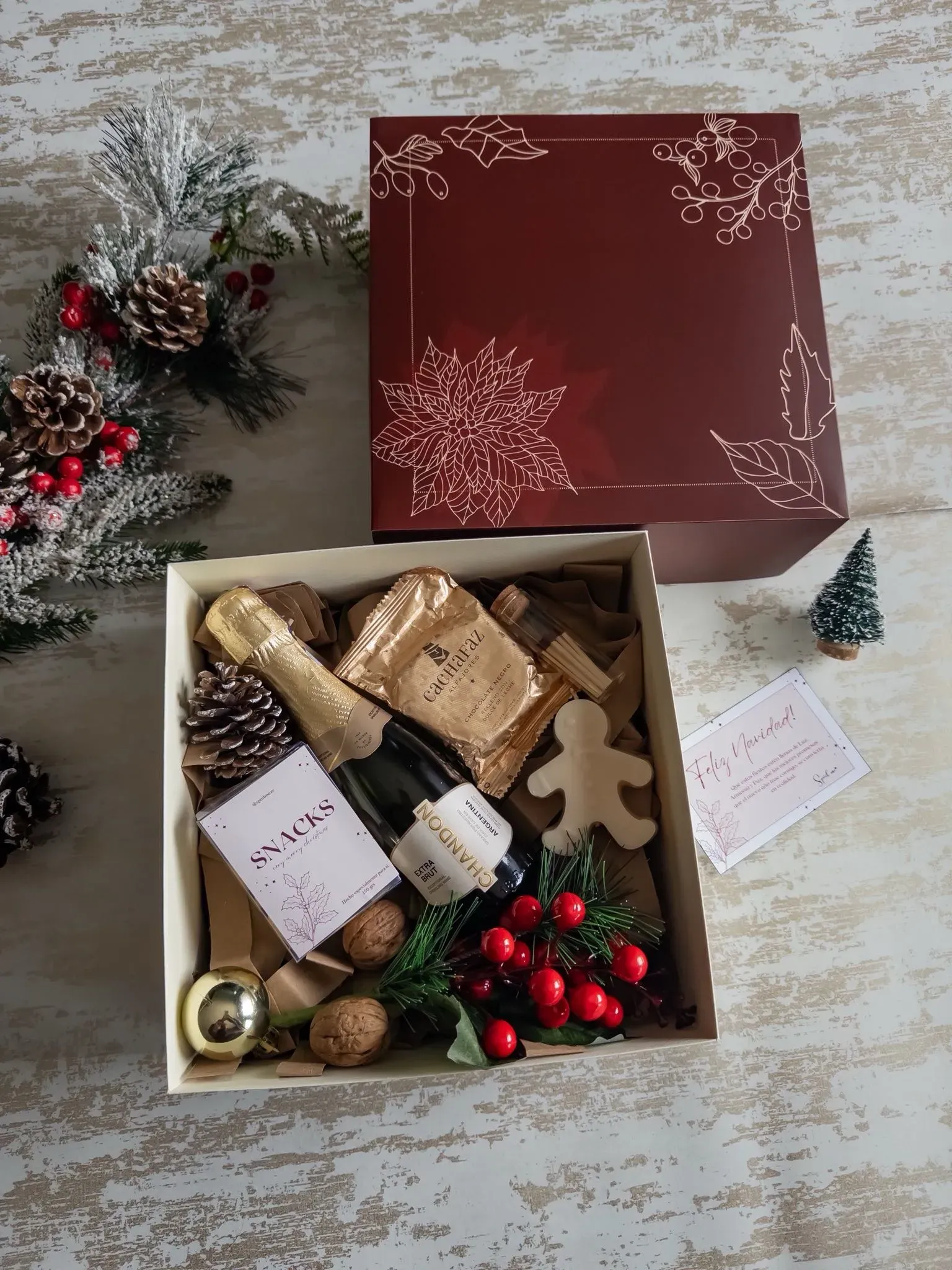 * Caja de cartulina reforzada personalziada con diseño navideño y logo