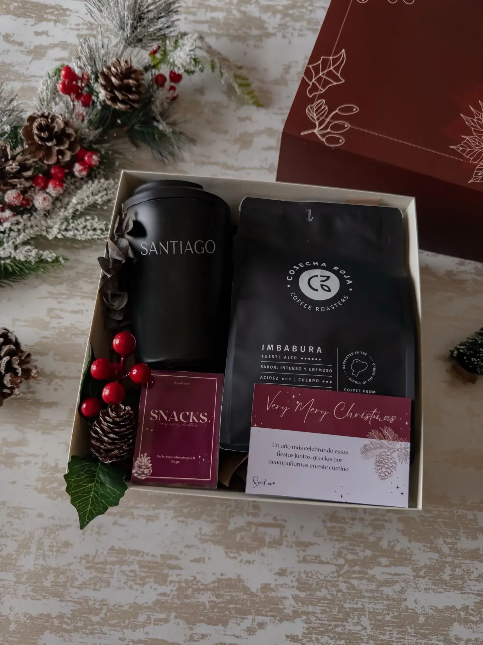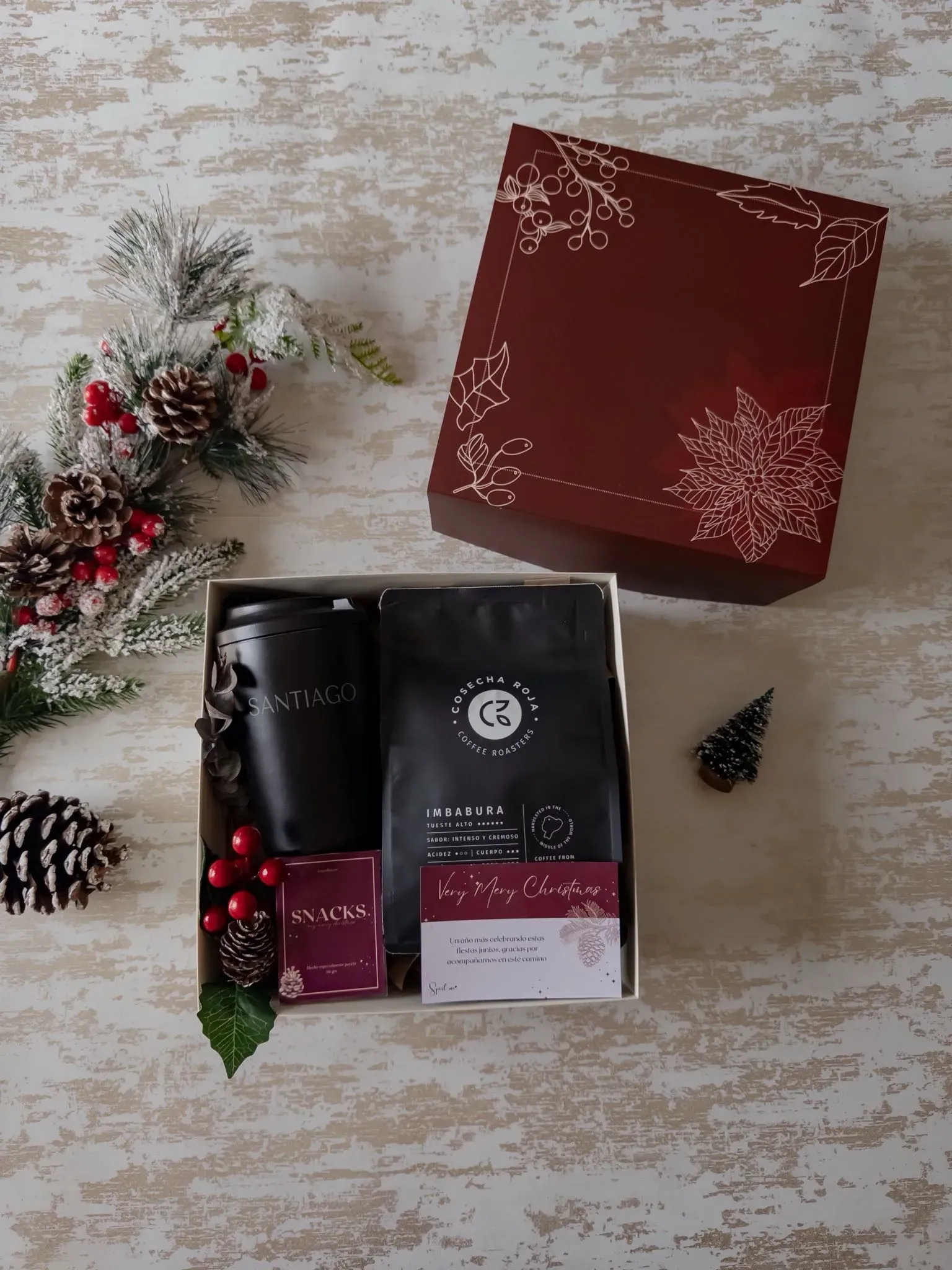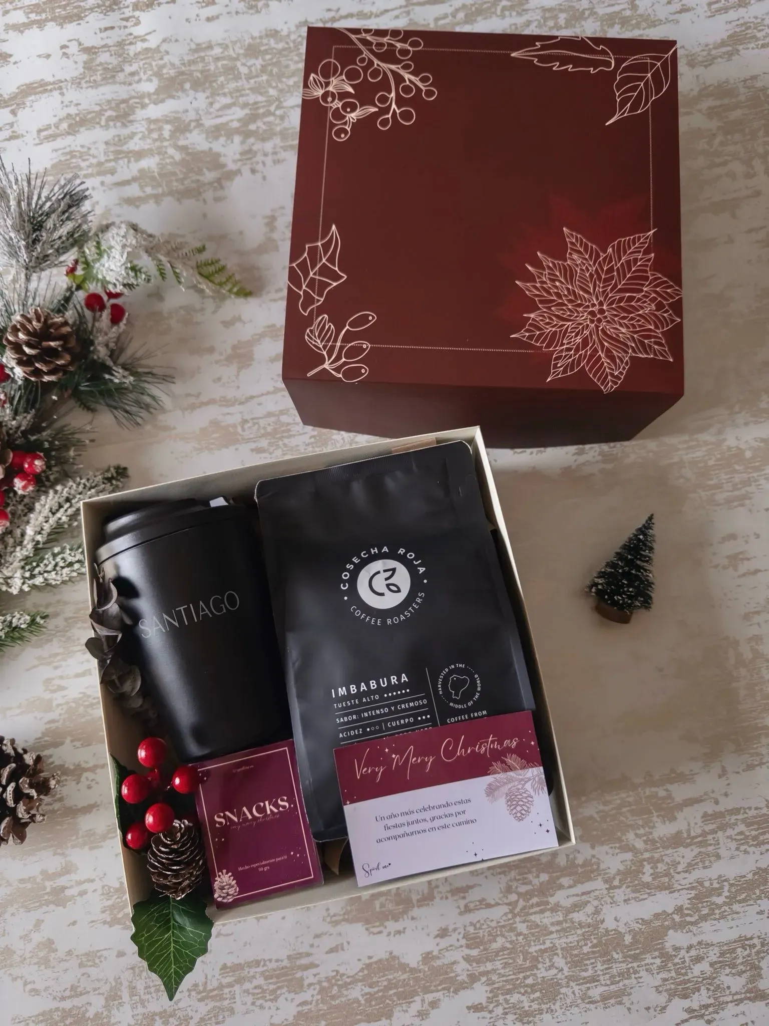 * Caja de cartulina reforzada personalziada con diseño navideño y logo
