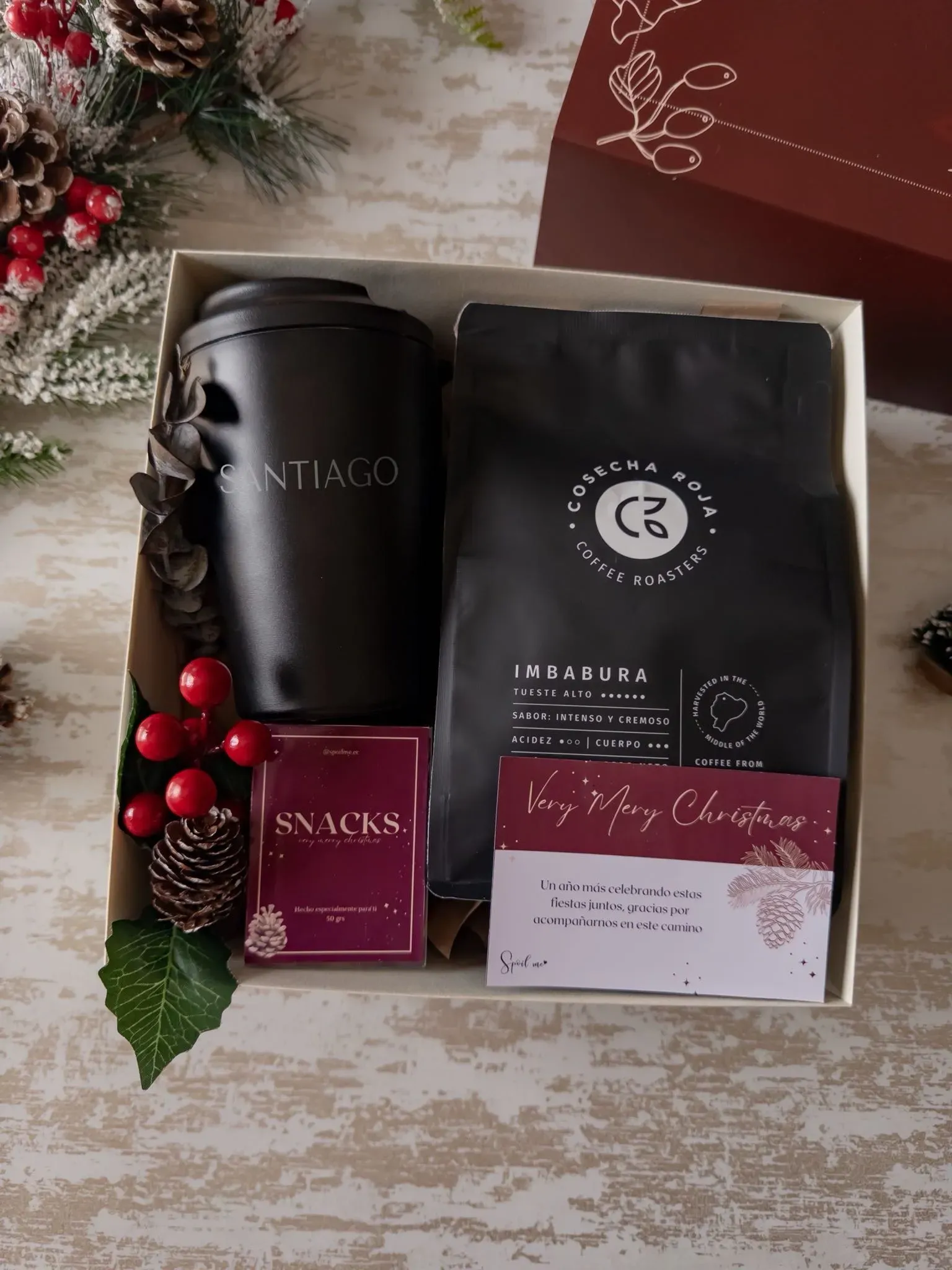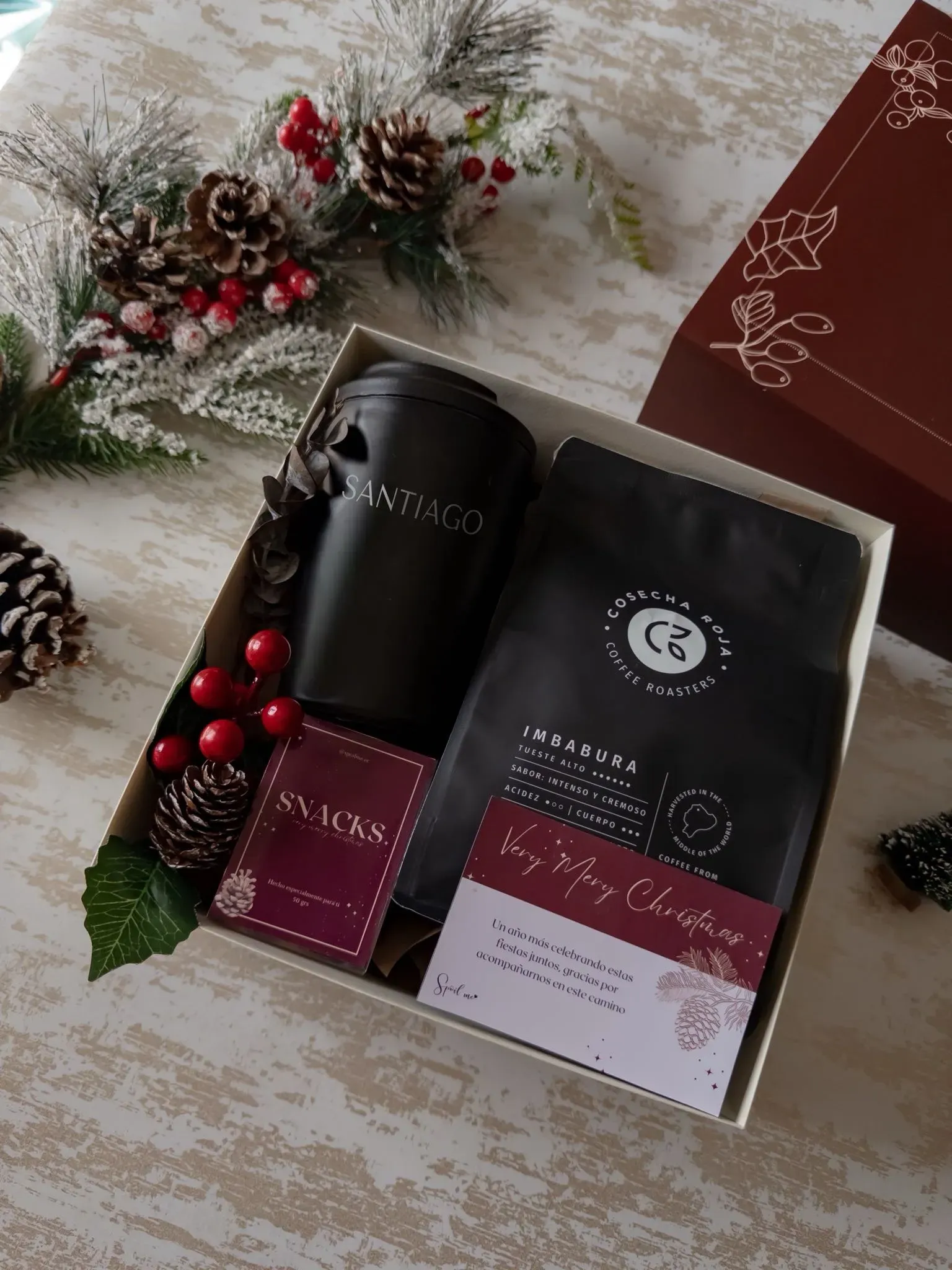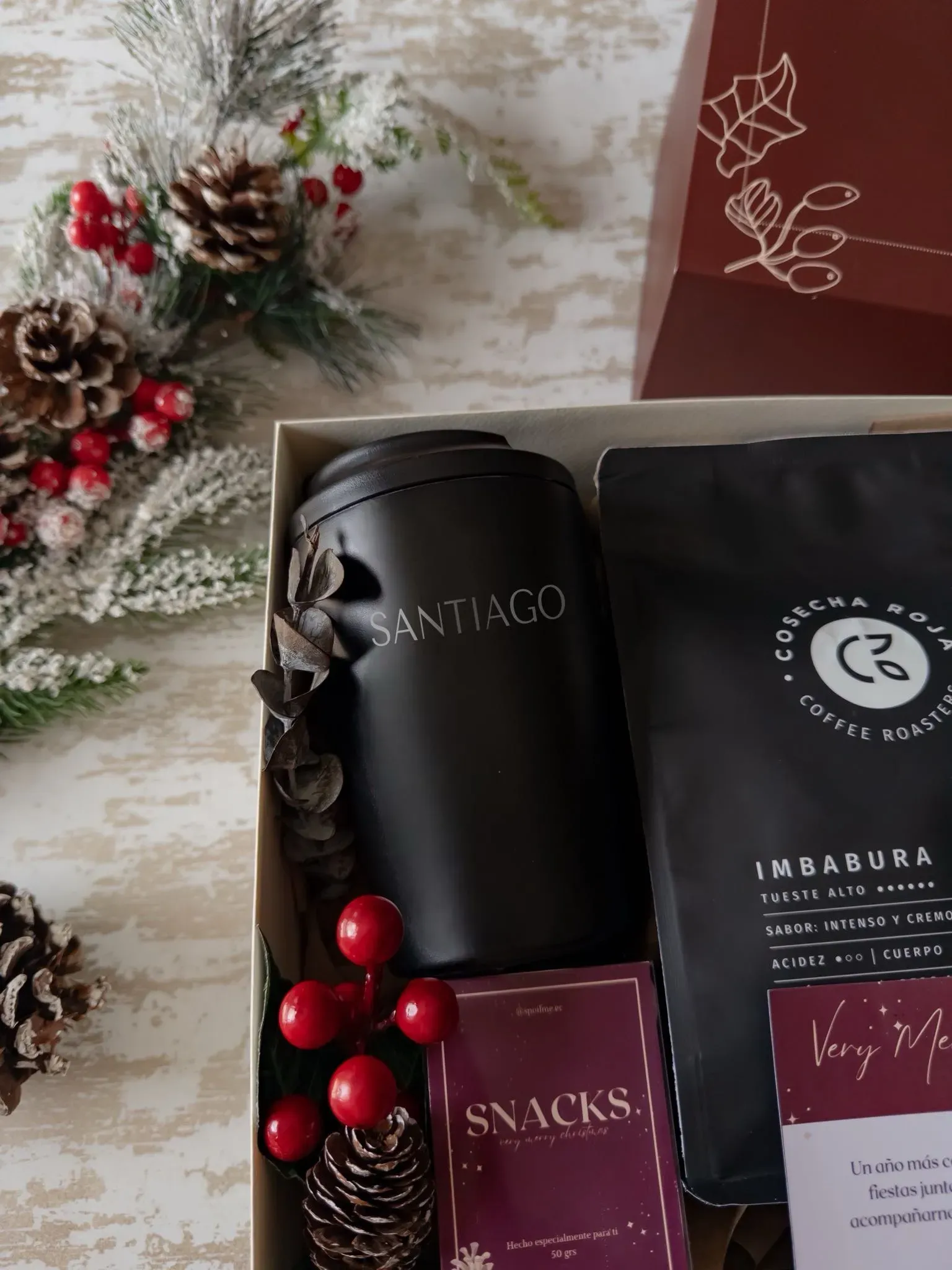 * Caja de cartulina reforzada personalziada con diseño navideño y logo