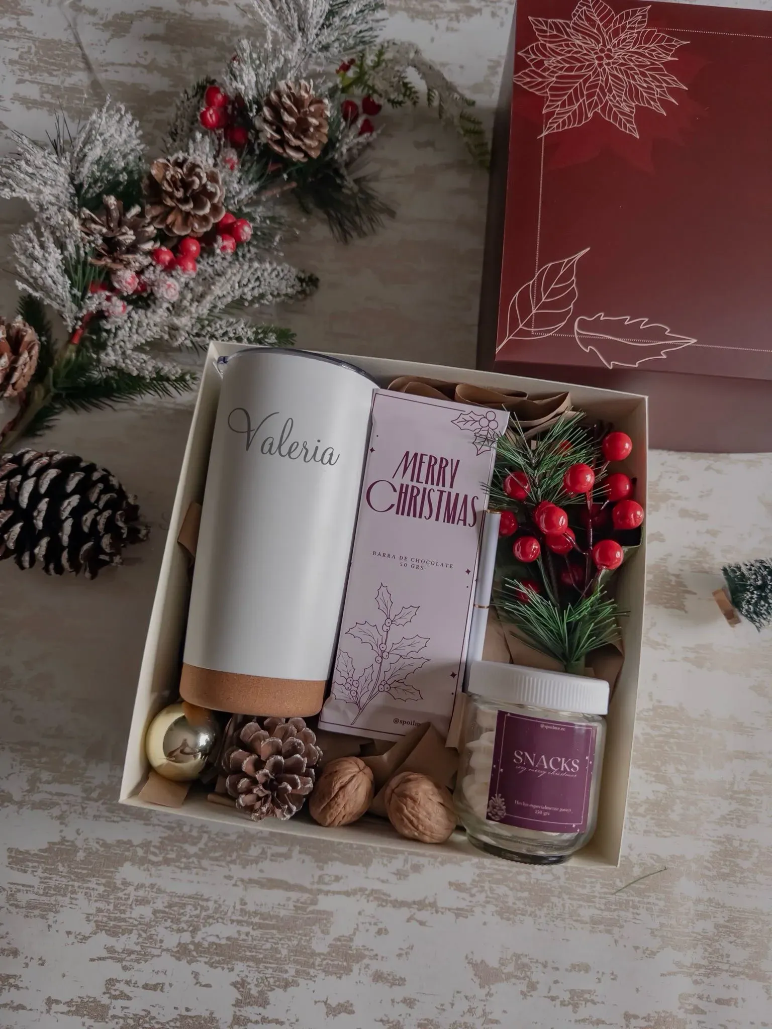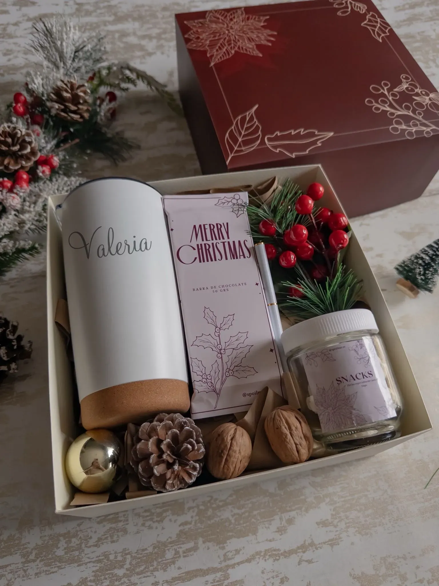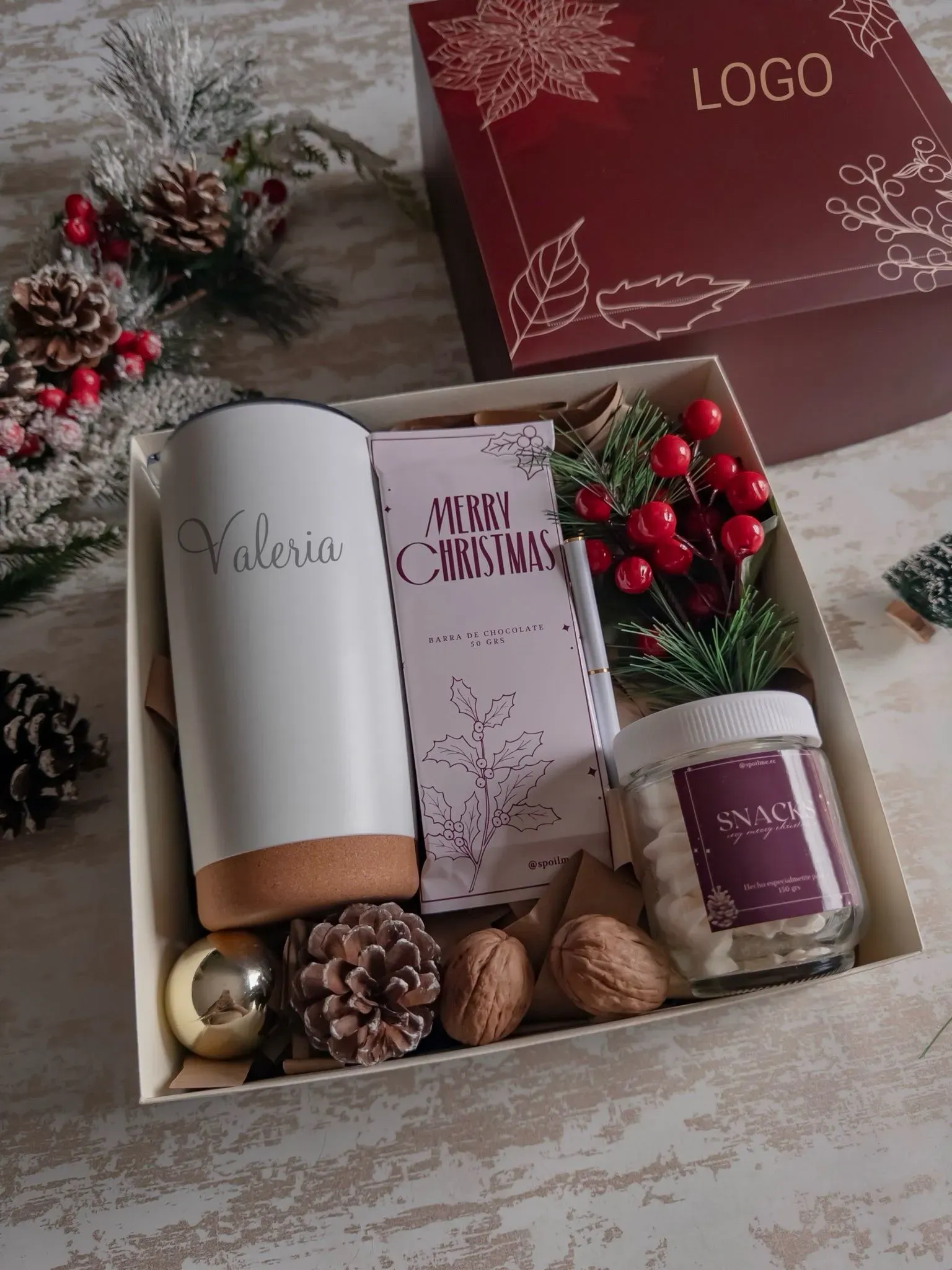 * Caja de cartulina reforzada personalziada con diseño navideño y logo