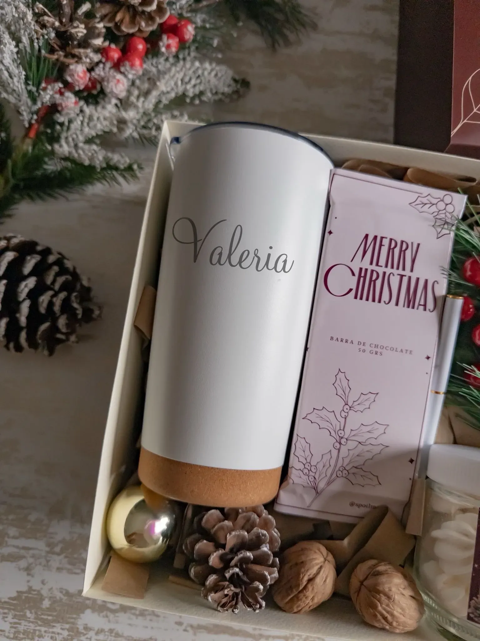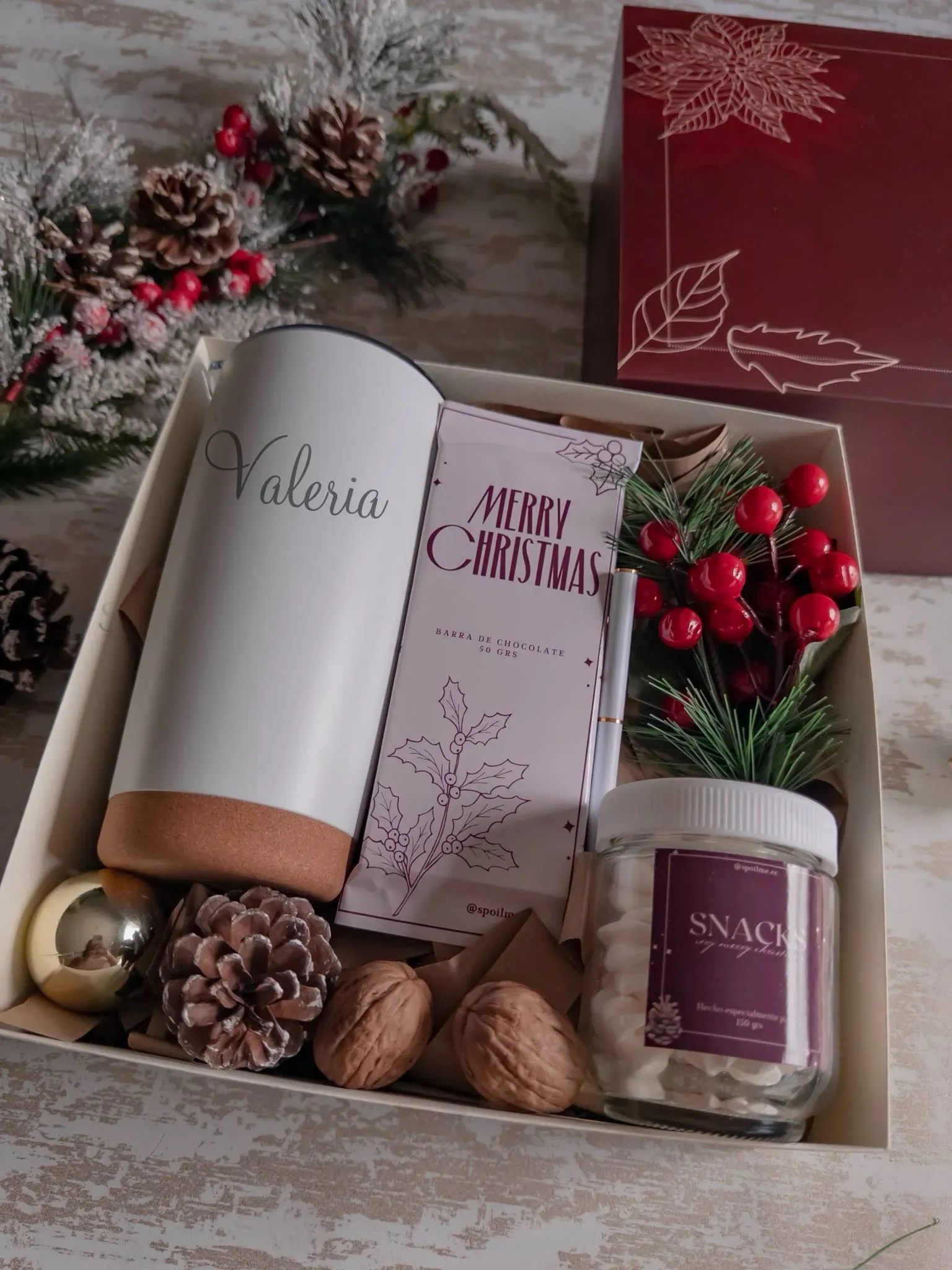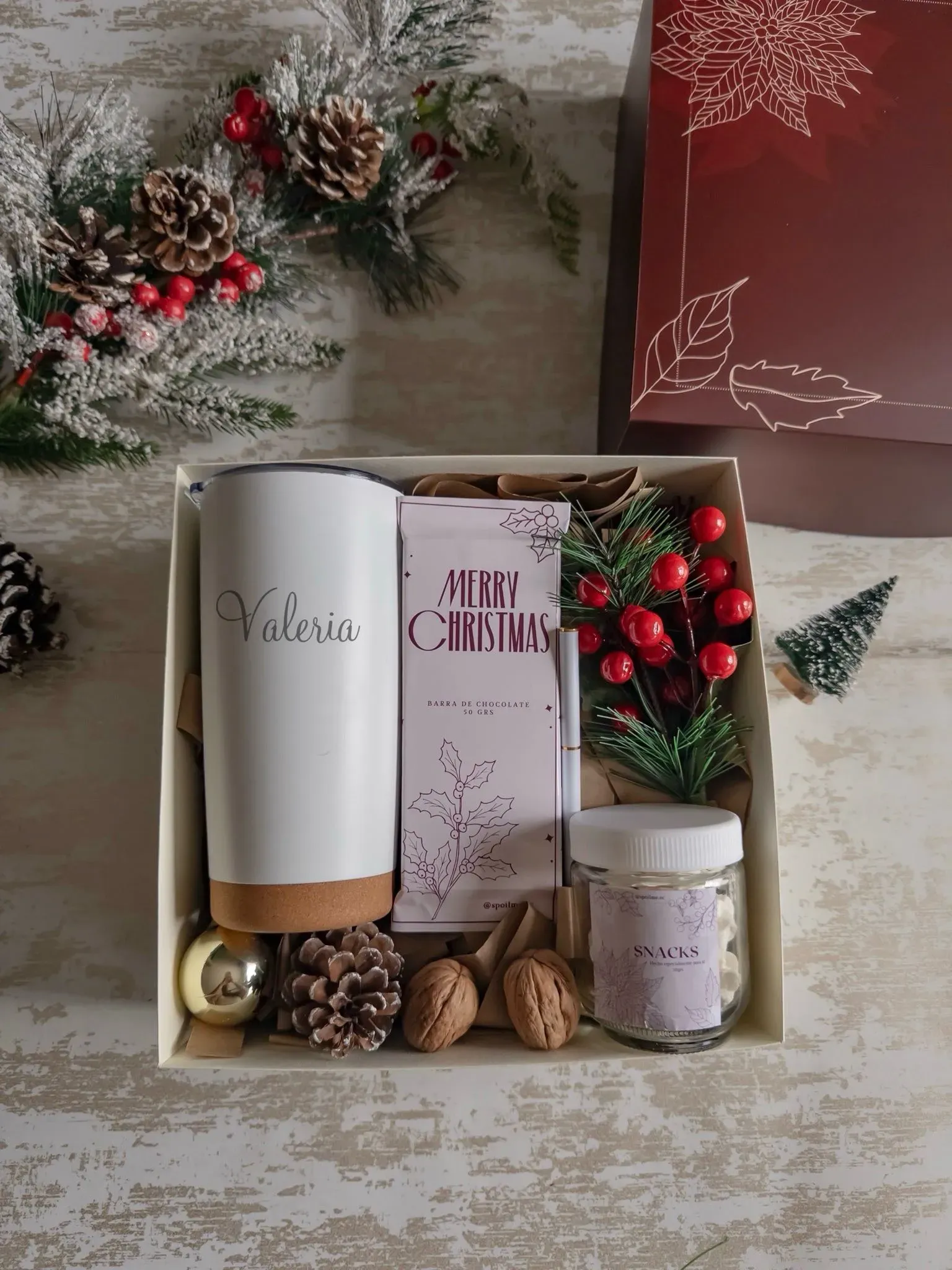 * Caja de cartulina reforzada personalziada con diseño navideño y logo