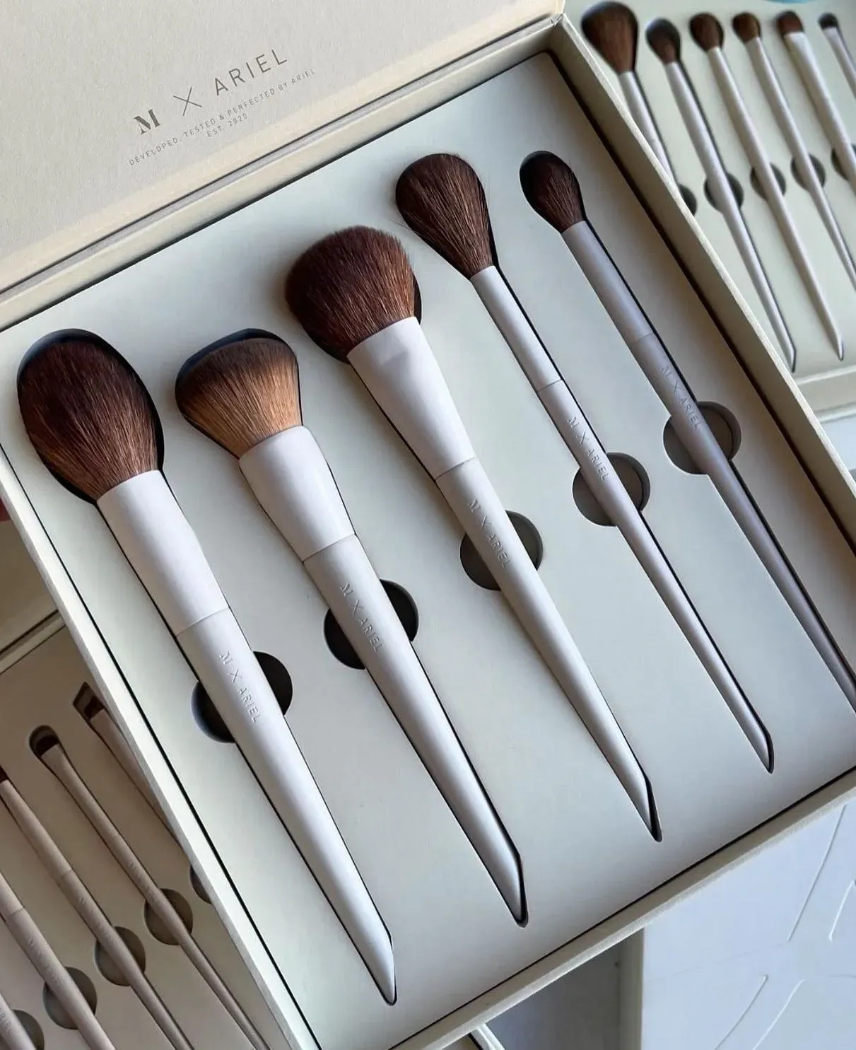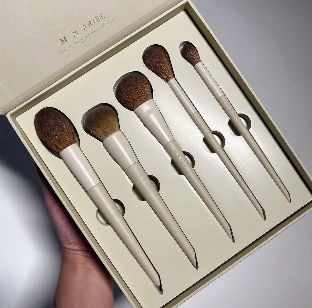 El maquillador de celebridades Ariel es conocido por su aspecto característico: ojos deslumbrantes, mezclas perfectas, líneas perfectas y reflejos y contornos que definen el rostro. Utilizando su experiencia, desarrolló, probó y perfeccionó meticulosamente el juego de brochas faciales de 5 piezas Mo...