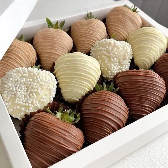 3 Fresas cubiertas de chocolate blanco con diseño de malla.