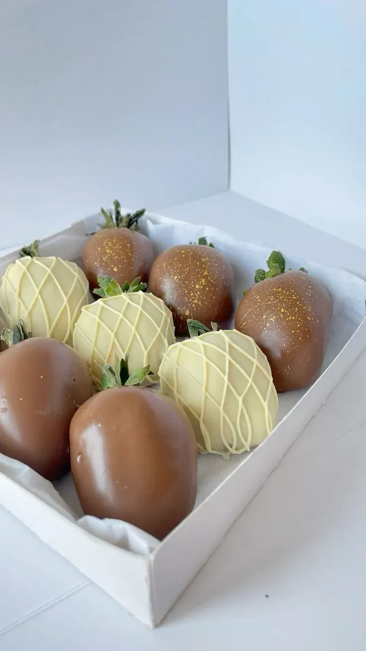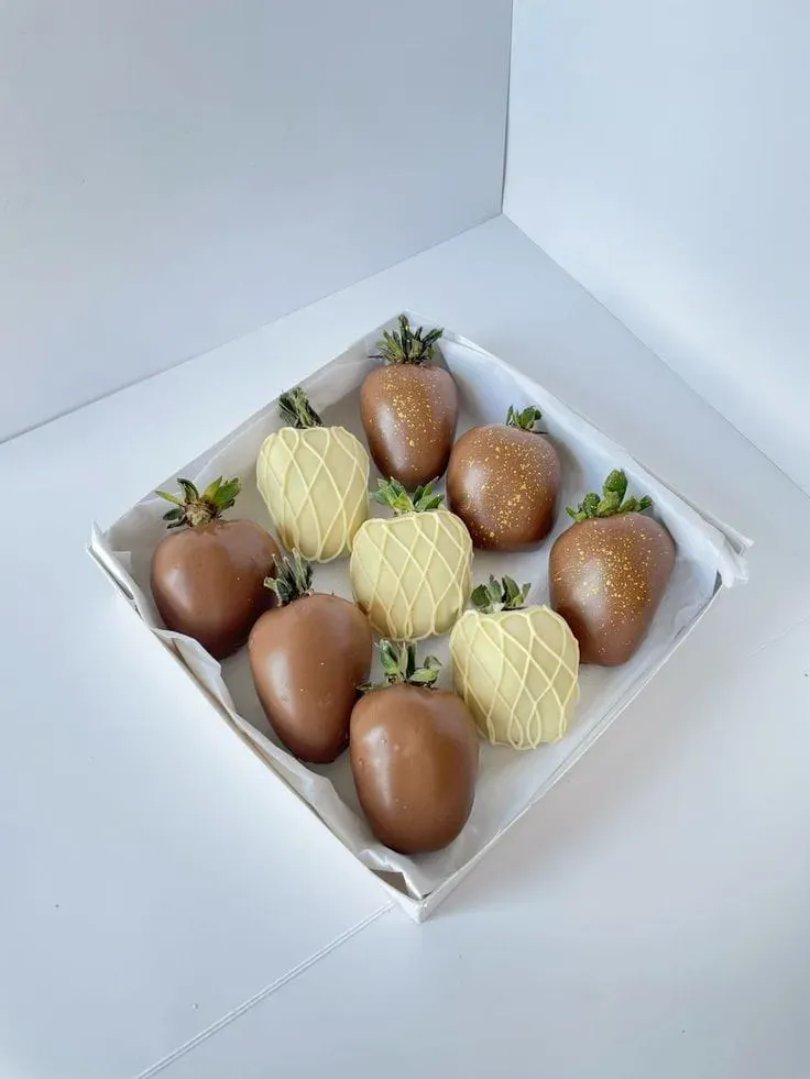 6 Fresas cubiertas con chocolate con leche y pintura comestible dorada.