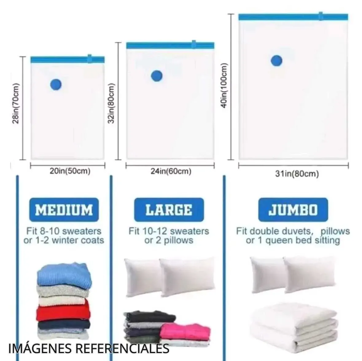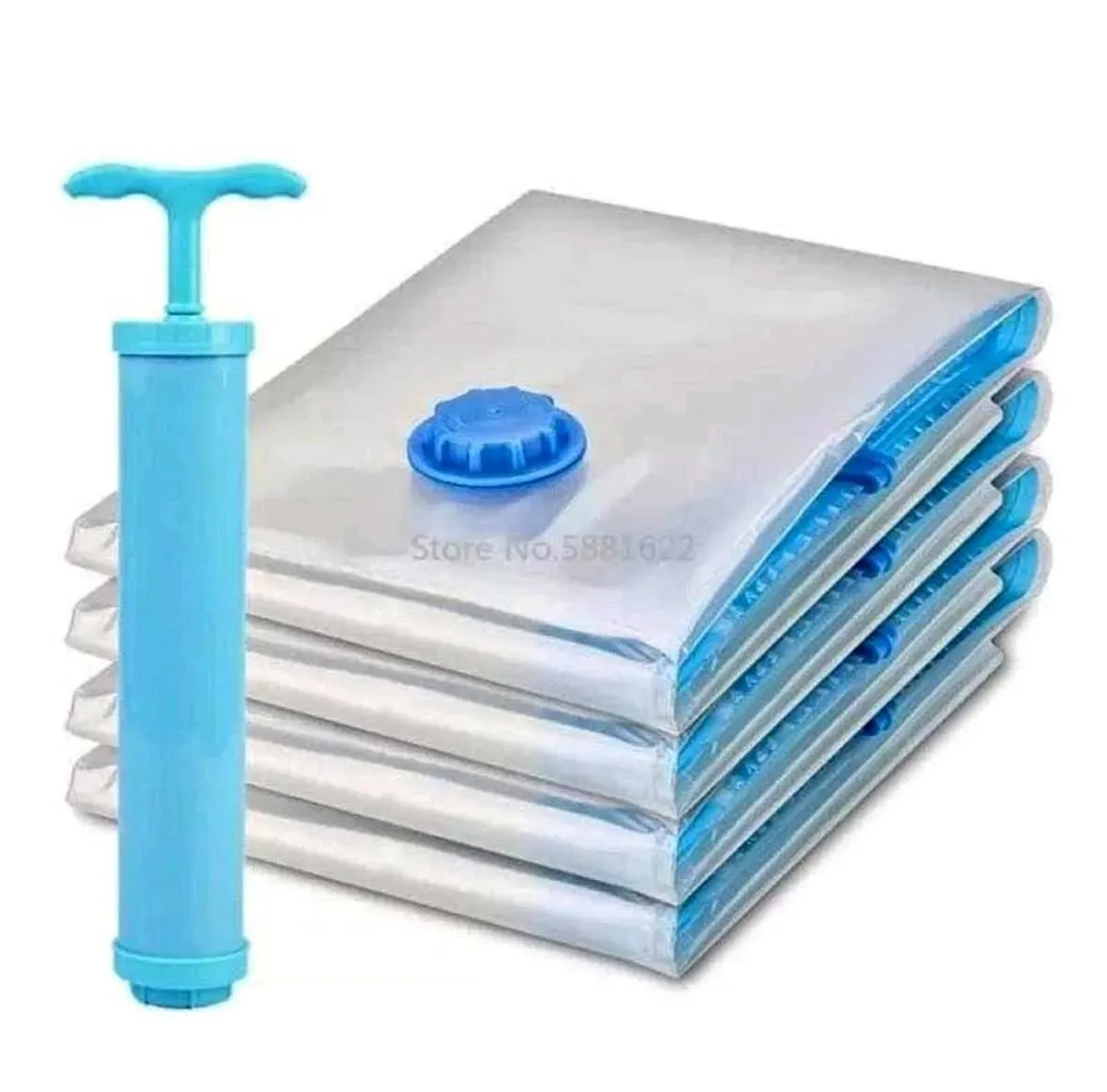 🔸 5 Bolsas al vacío con 3 tamaños: 1 jumbo (100*80cm), 2 large (80*60cm), 2 medium( 70*50cm) y 1 bomba de mano.