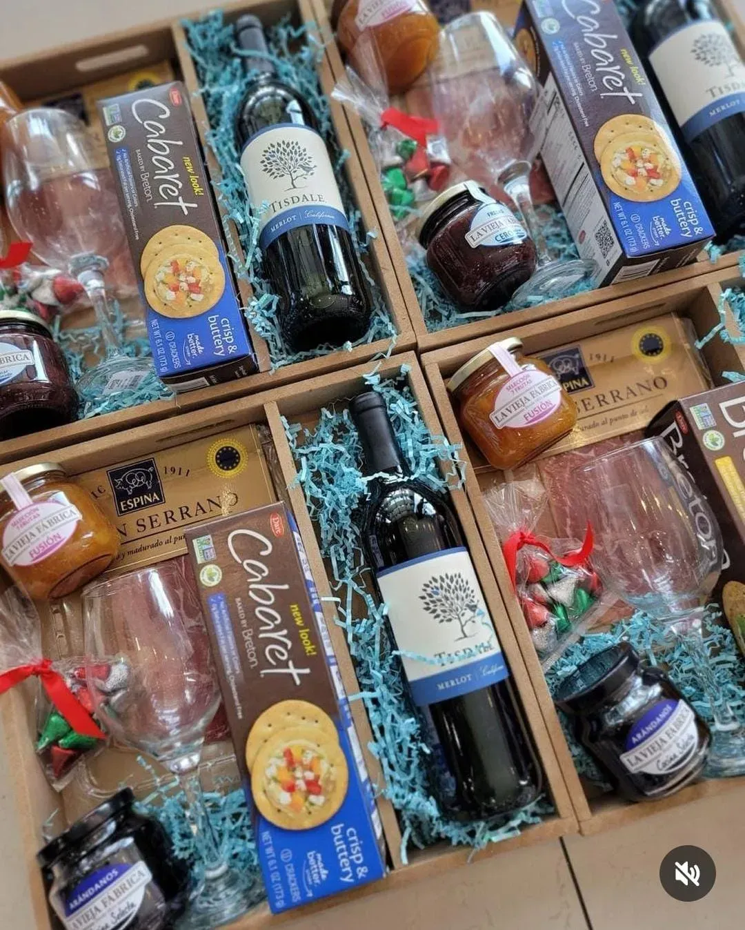 1 Vino Tinto Cabernet Sauvignon Tisdale 75 Cl, 1 paquete de galletas Original Table Water Carr'S, 1 mermelada de melocoton, 1 meremelada de arandanos, 60 gr de jamon serrano, 12 chocolates kisses, 1 copa de cristal grabada, 1 bandeja con division, envoltura en papel termoencogible y tarjeta persona...