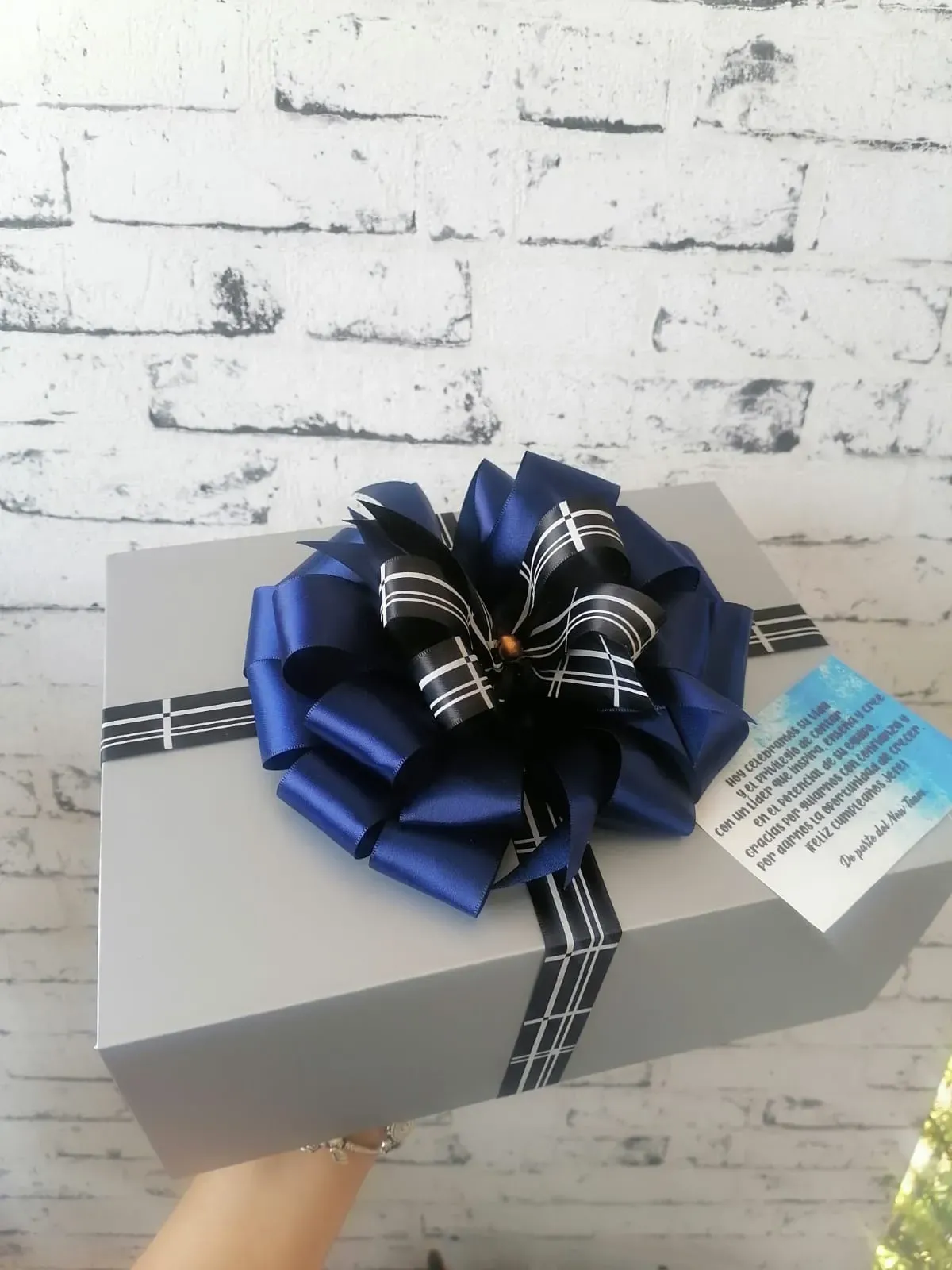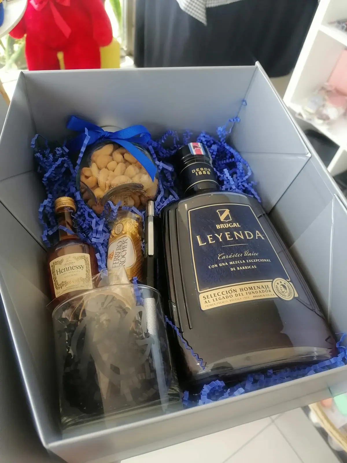 1 Brugal leyenda, 1 vaso de cristal grabado, 1 portarretratos con imagen personalizada, 1 petaca de metal, 1 set de 3 chocolates ferrero Rocher, 1 mini Hennesy Vsop, 1 frasco de cristal con semillas, ,1 fundita con 5 limones deshidratados, envolturacaja imantadapremium.