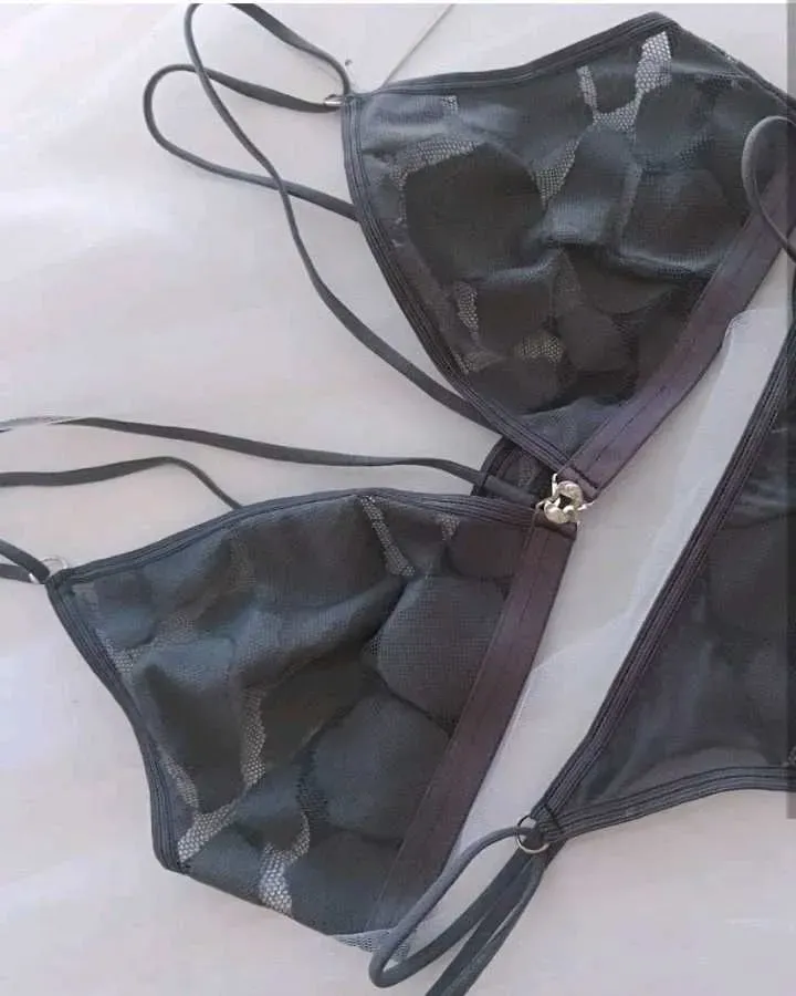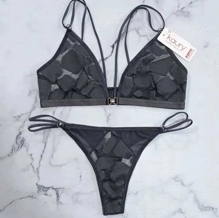 Conjunto de encaje y tul. Corpiño triangulito con gancho delantero, detalle en espalda y cola less.
