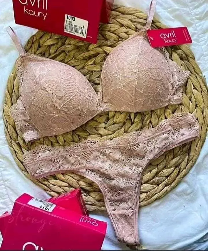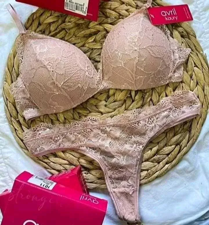 Conjunto de puntilla. corpiño triangulito taza soft sin push up y cola less.
