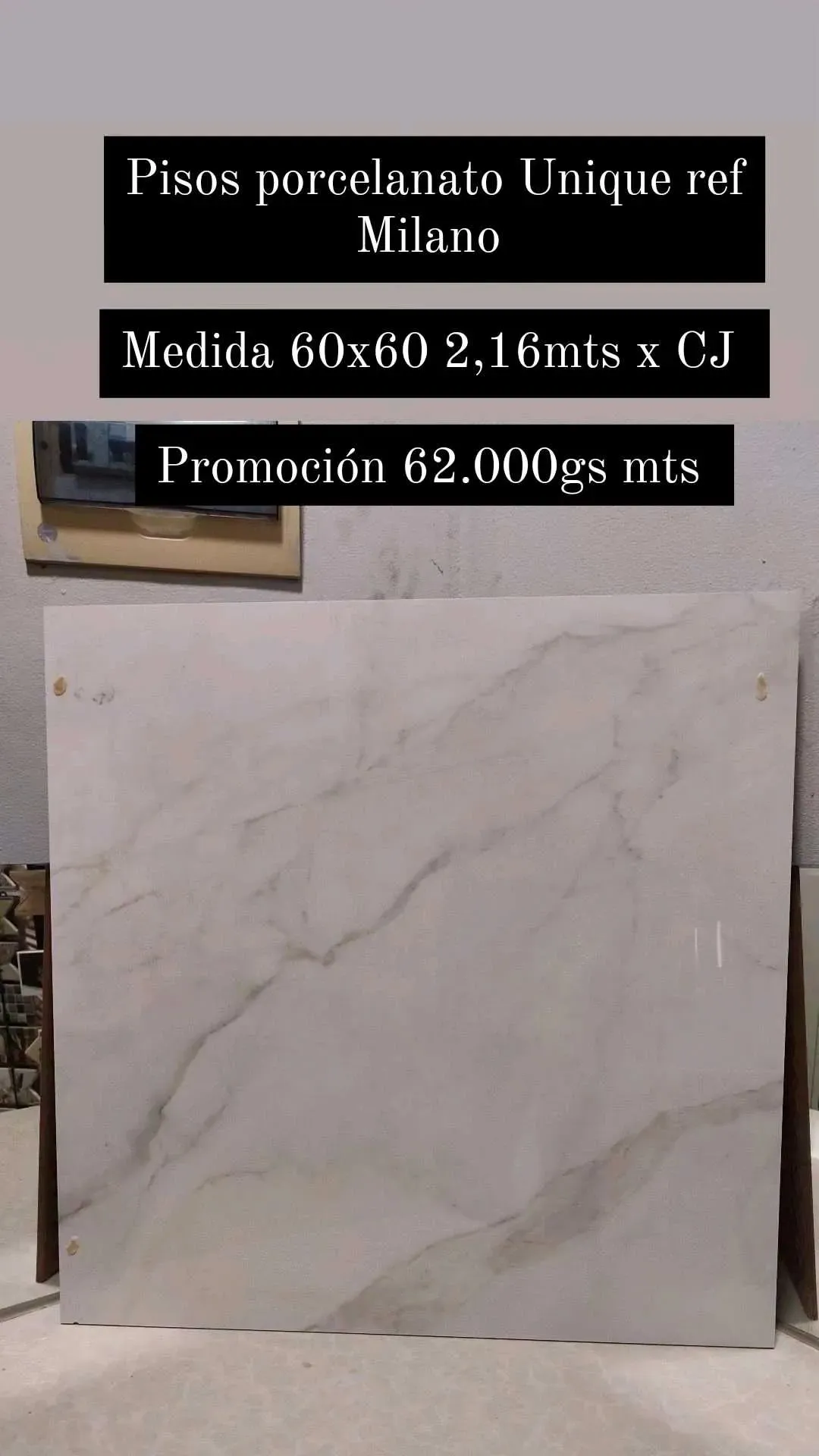 Pisos Porcelanato Unique ref Milano de alta calidad en formato 60x60, ideal para dar un toque elegante a tus espacios. Cada caja contiene 2,16 metros cuadrados de este hermoso porcelanato. Renueva tus pisos con estilo y durabilidad.