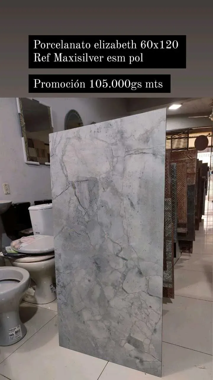 Porcelanato Elizabeth maxisilver pulido de alta calidad en tamaño 60x120 cm, ideal para dar un toque elegante y moderno a tus espacios. Cada caja contiene 1.44 metros cuadrados de este hermoso revestimiento para pisos. ¡Renueva tu hogar con estilo y distinción!