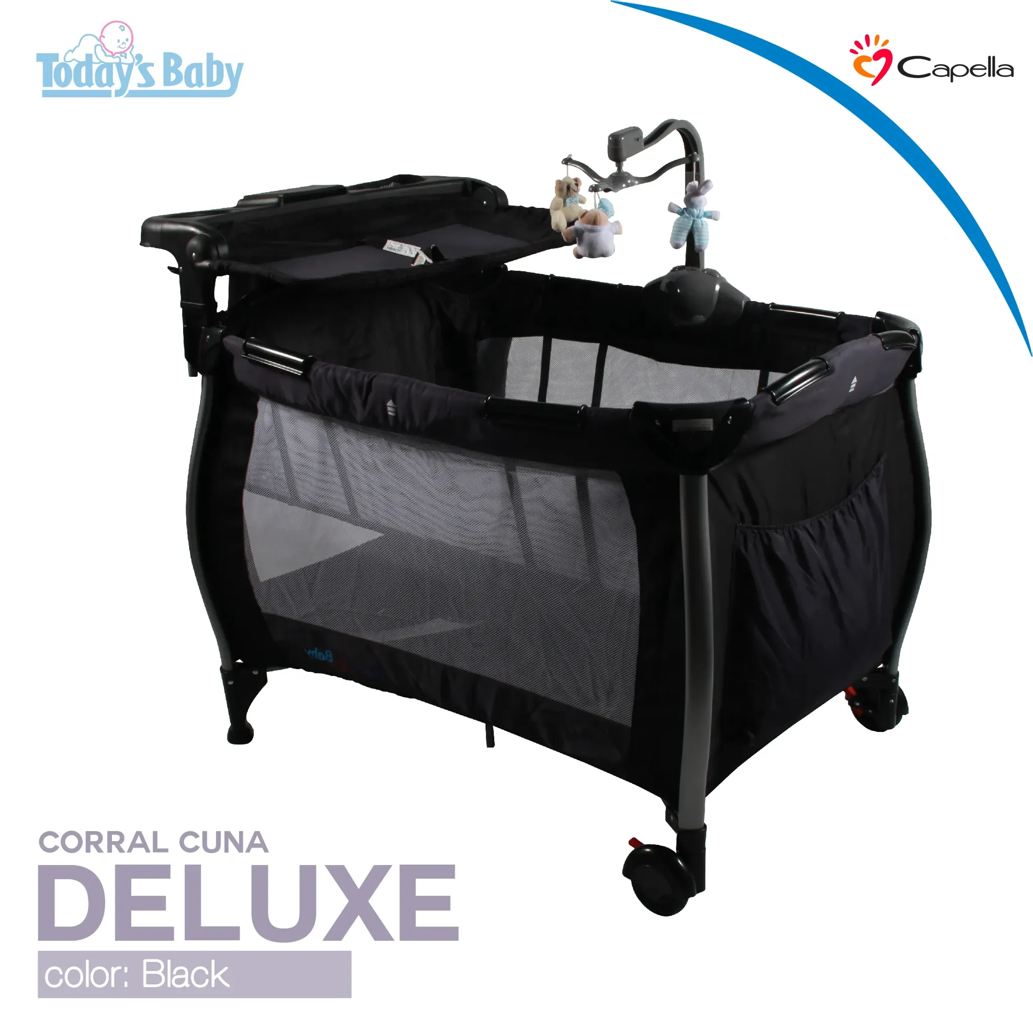 tiene cambiador aéreo , doble altura , móvil musical con luces y sonidos , vibrador , mosquitero y es Packing Play con bolso 👜 para transportar .