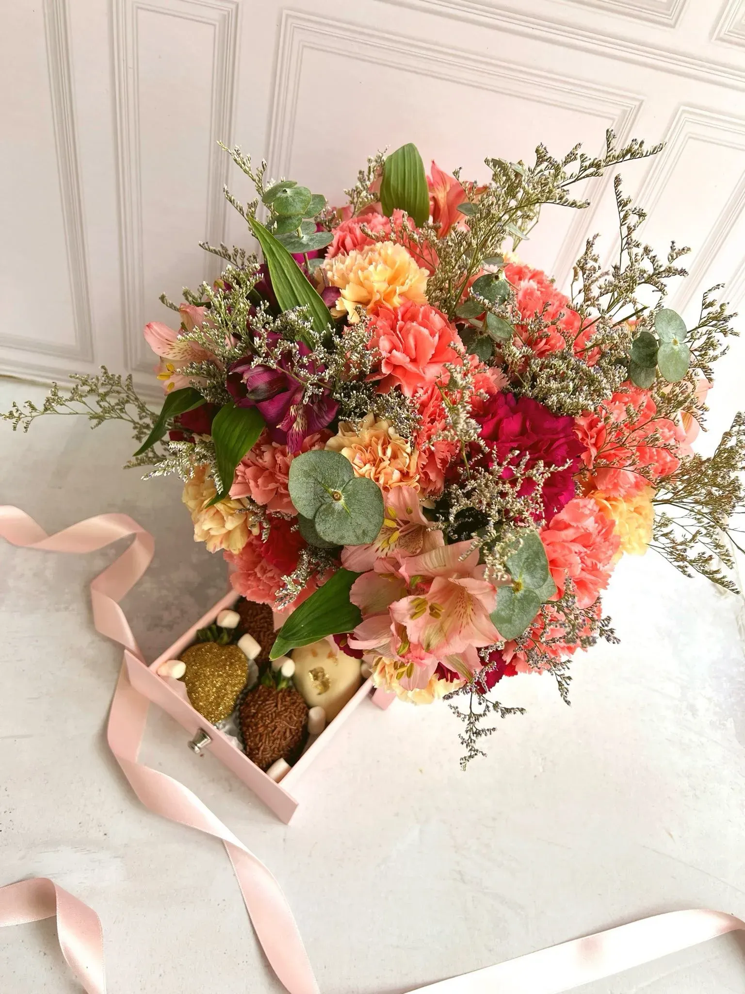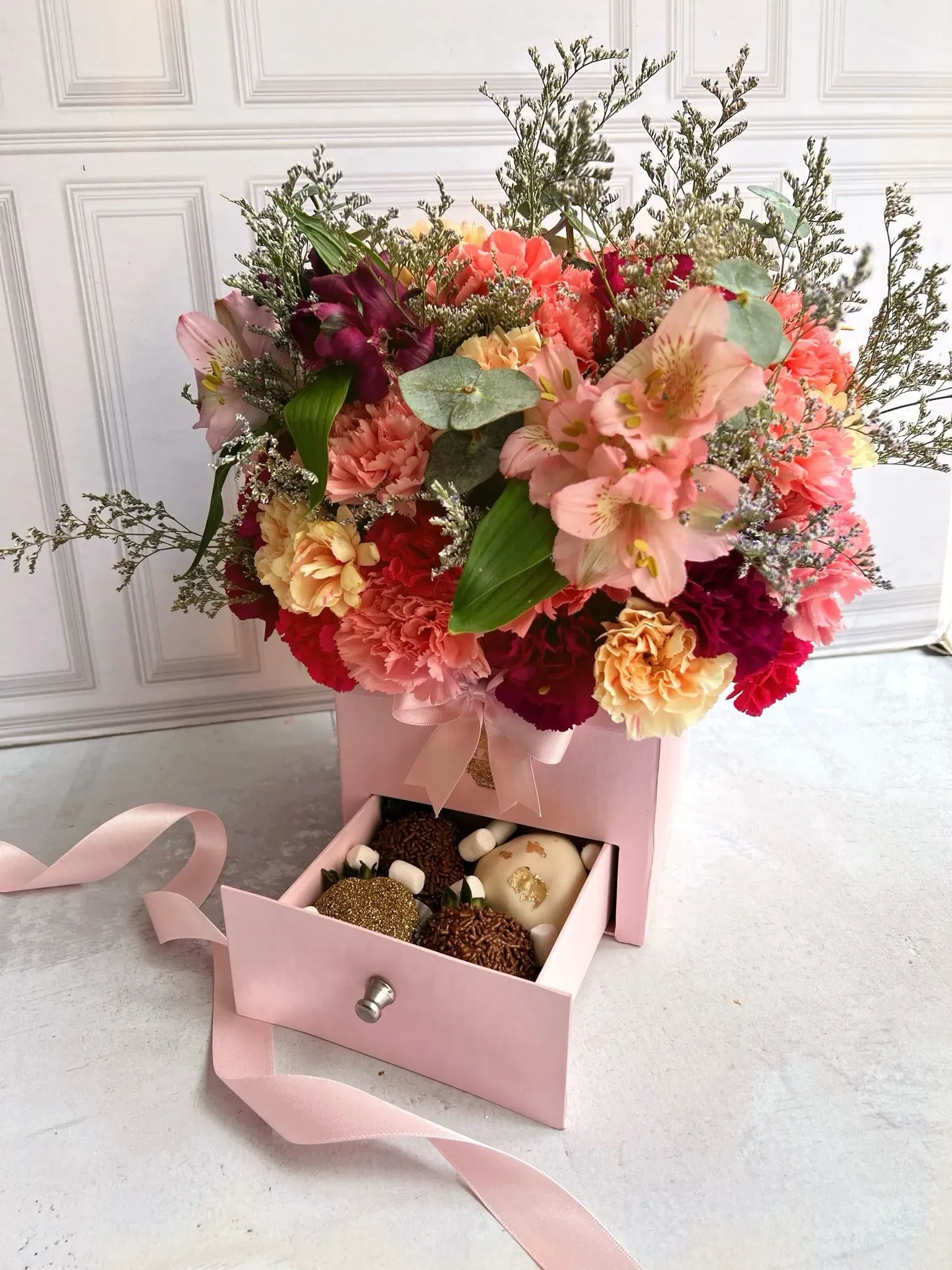 Esta caja de lujo, disponible en color rosado, incluye un hermoso arreglo de flores naturales (claveles, caspia, eucalipto y astromelias), acompañadas de 4 fresas cubiertas con chocolate.