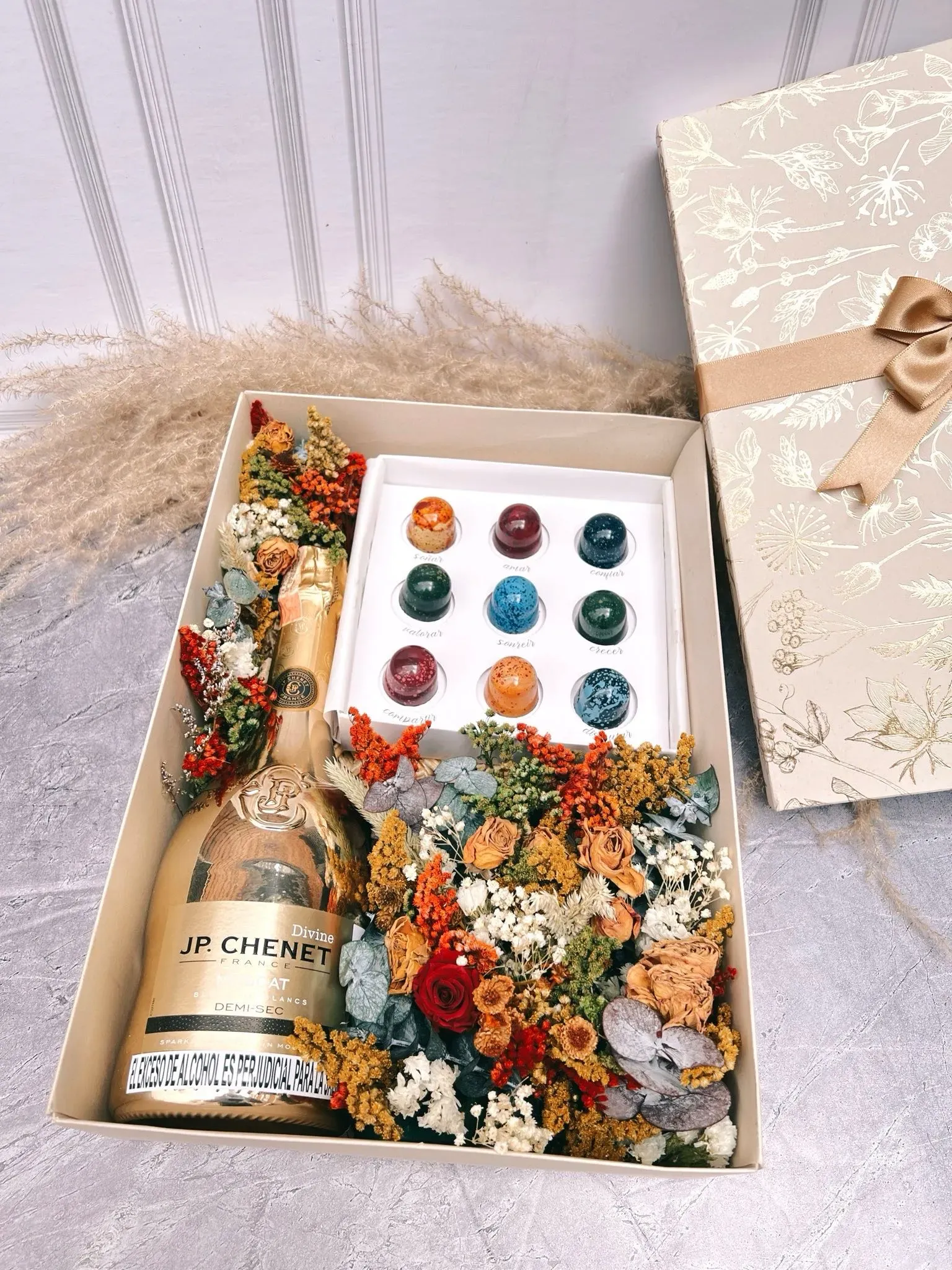 Presentada en una elegante caja beige con detalles dorados, esta edición incluye nuestra icónica caja de bombones 11:11 con 9 unidades artesanales rellenas de ganache en sabores como frutos rojos, maracuyá, crema de whisky, matcha, ca...