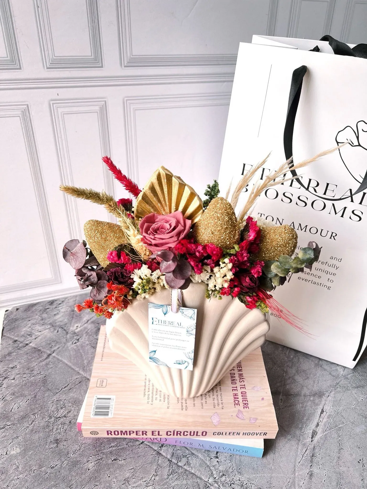 Arreglo de flores secas y preservadas que no requieren agua, pero conservan su esencia y pueden durar varios años. Presentado en un florero en forma de concha, es perfecto para decorar cualquier espacio. Incluye 3 fresas cubiertas de chocolate y una palma de chocolate, ofreciendo un detalle dulce y ...