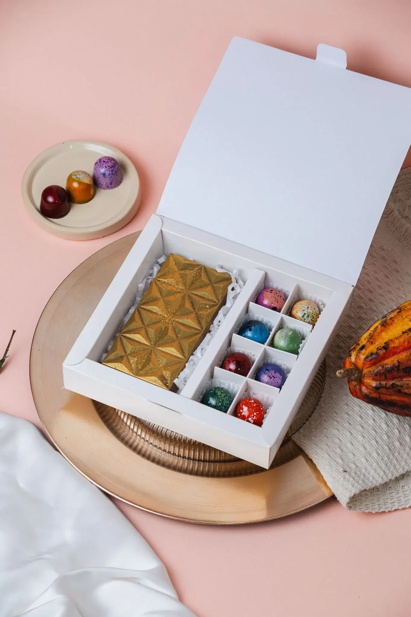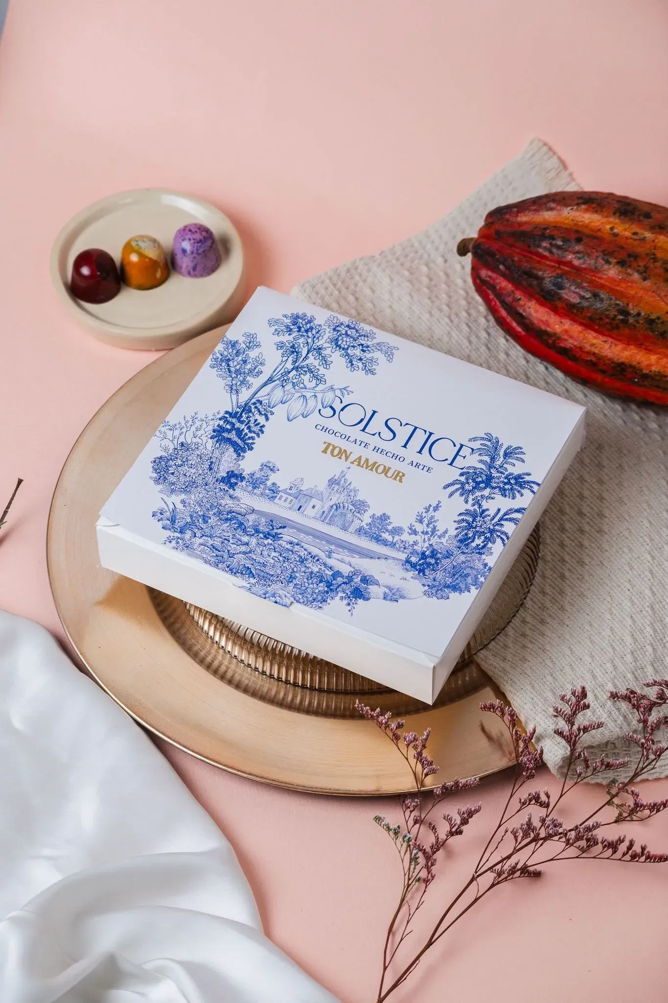Presentada en una caja blanca con estampado artístico en azul cobalto, esta edición incluye 8 bombones artesanales con rellenos de ganache en sabores como frutos rojos, maracuyá, crema de whisky, matcha,...