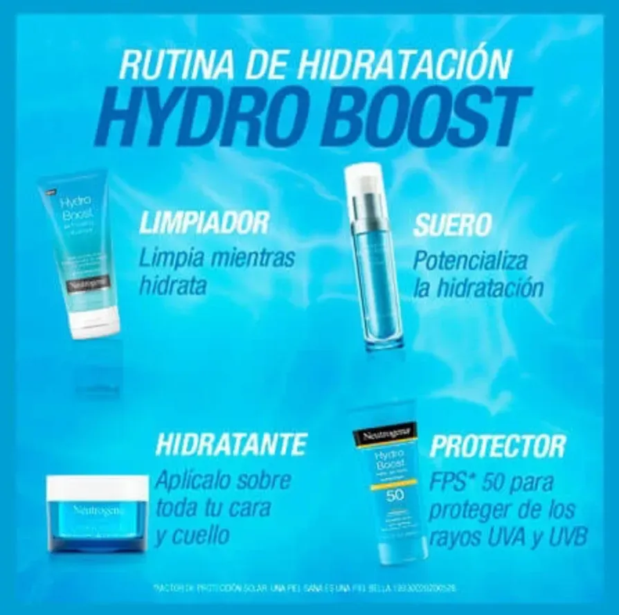 Protector Solar NEUTROGENA® HYDRO BOOST® con Factor de Protección Solar FPS 50 con Tecnología HELIOPLEX® que ofrece protección superior de amplio espectro contra rayos UVA/UVB. Con una textura ligera que maximiza la hidratación en tu piel hasta por 8 horas, gracias a su fórmula con Ácido Hialurónico...