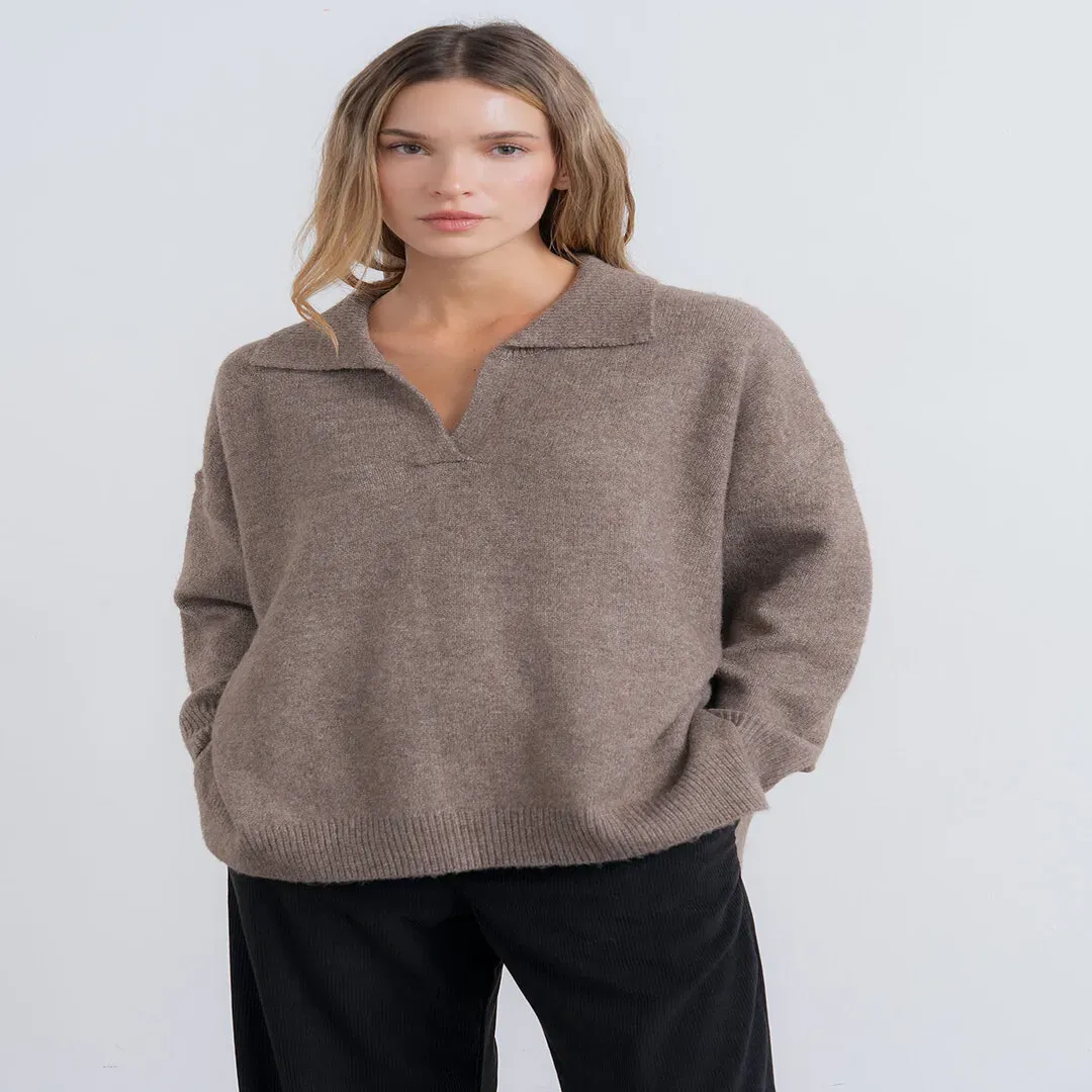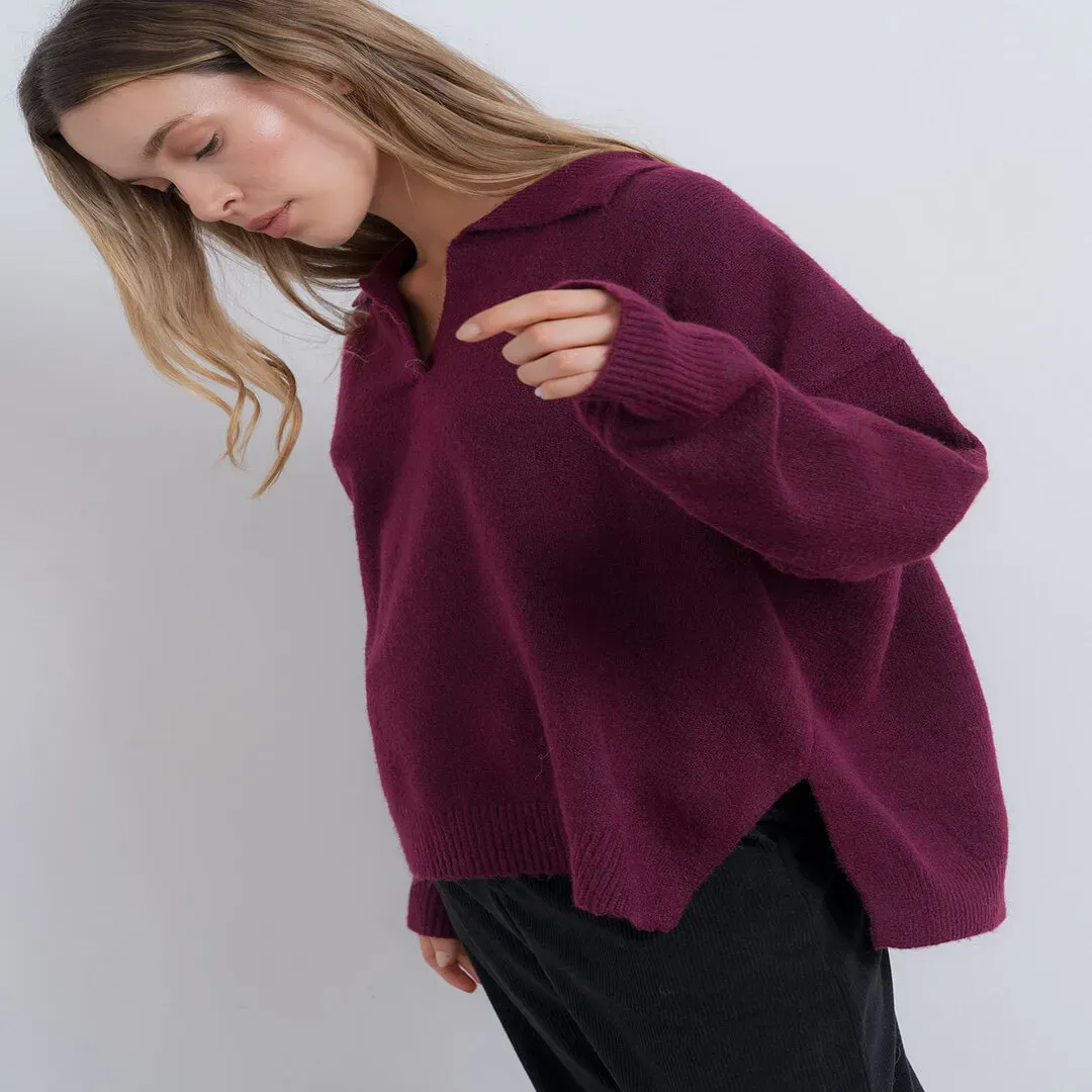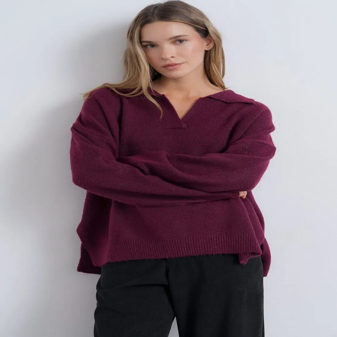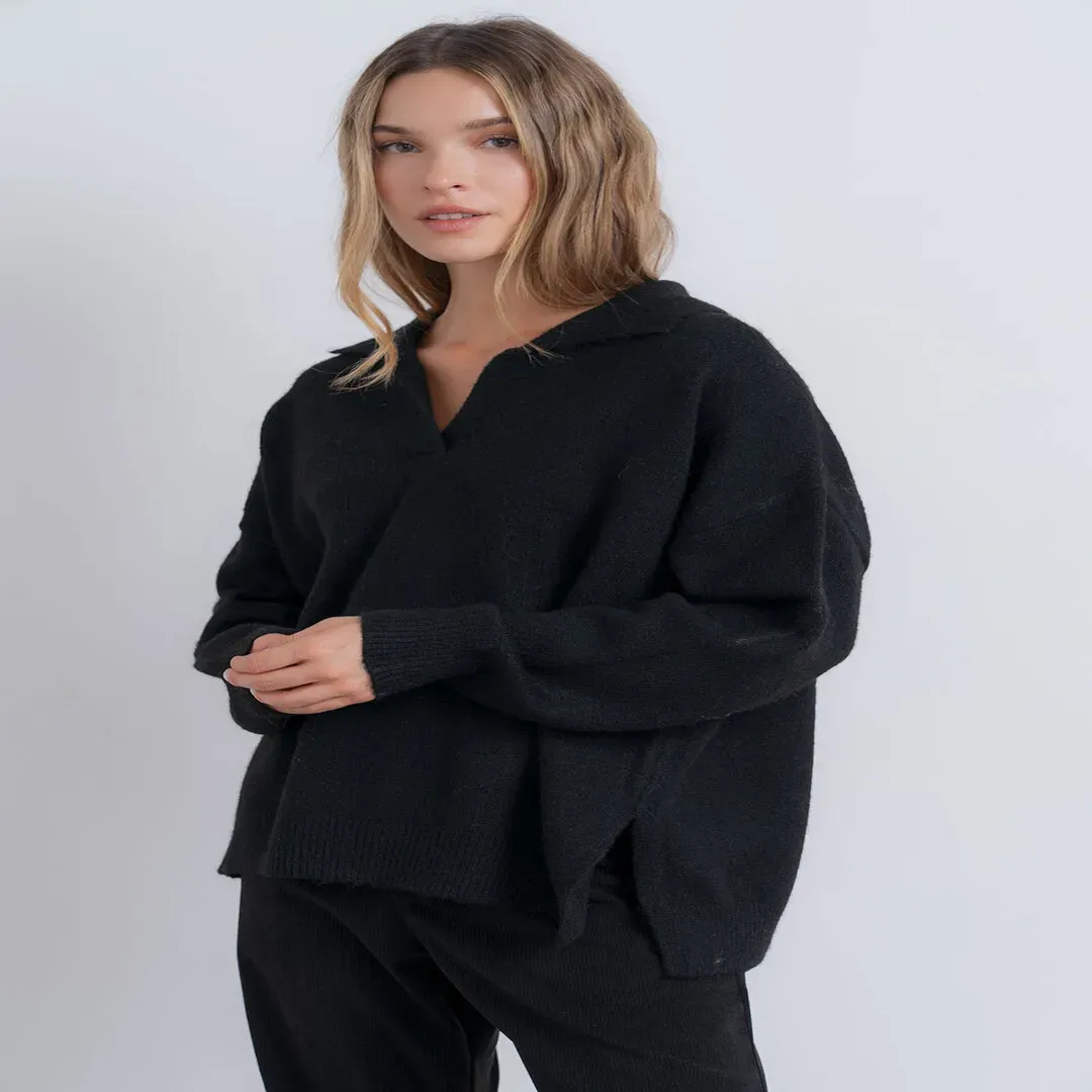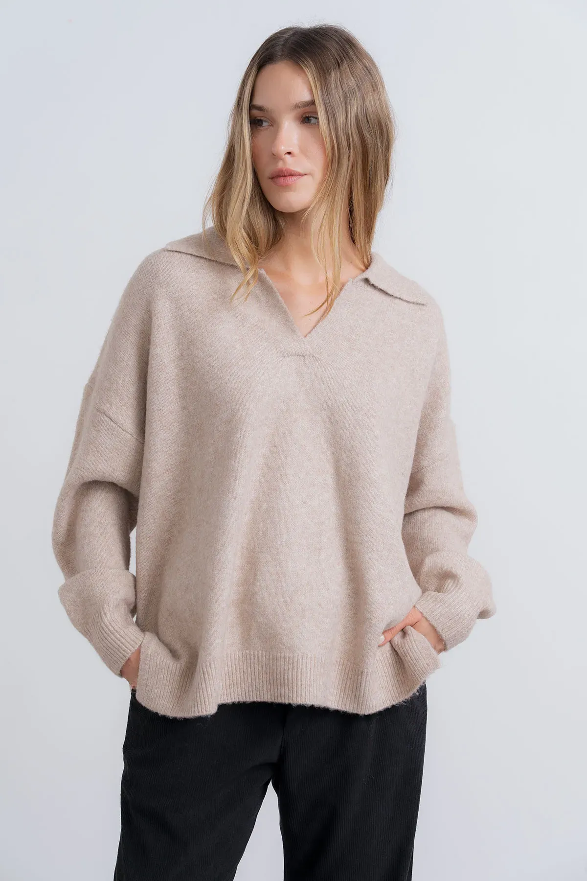 Sweater tejido con lana, escote v con cuello tipo camisa y tajos laterales.