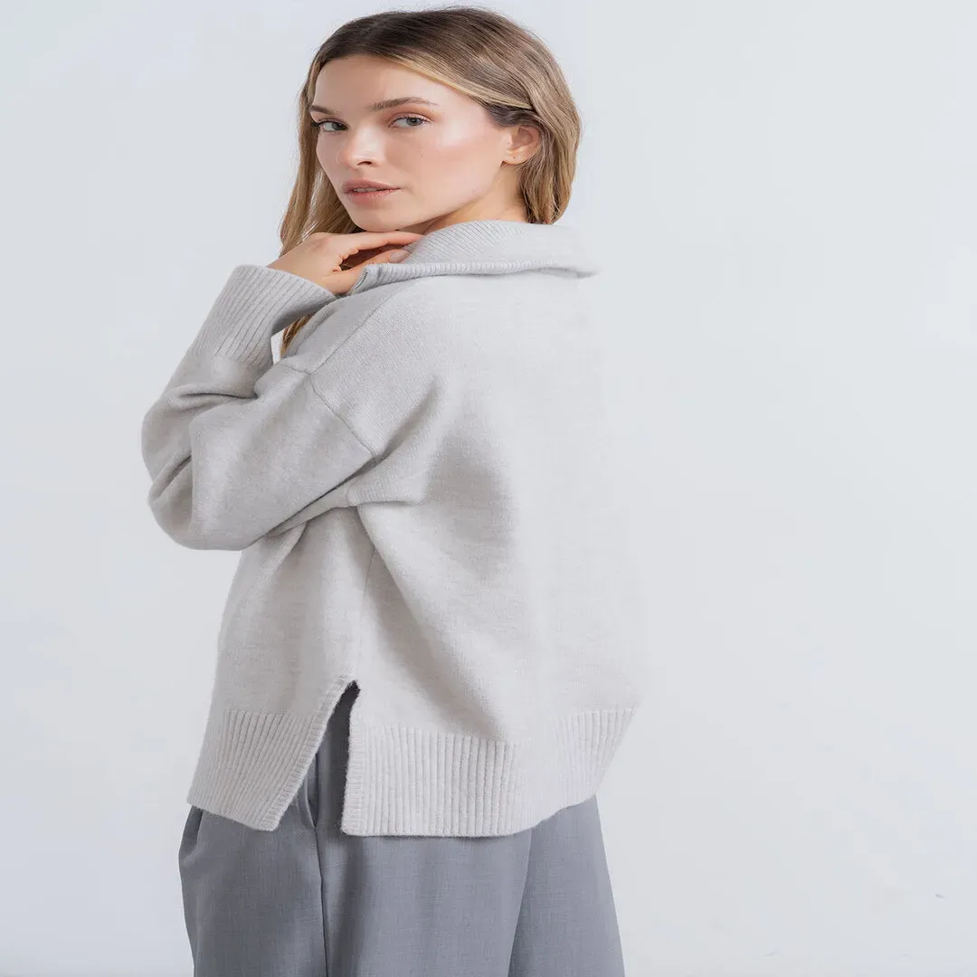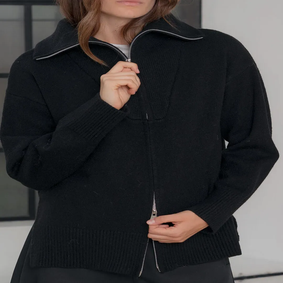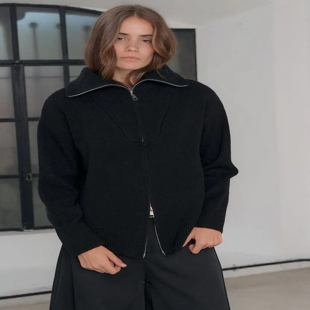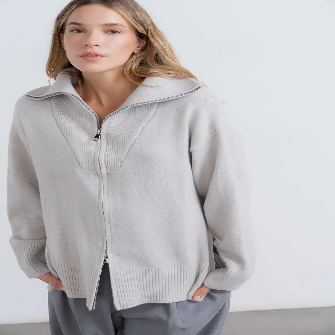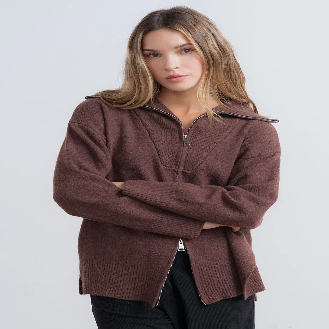 Sweater tejido con cierre bidireccional, cuello alto, manga larga, con tajos laterales.