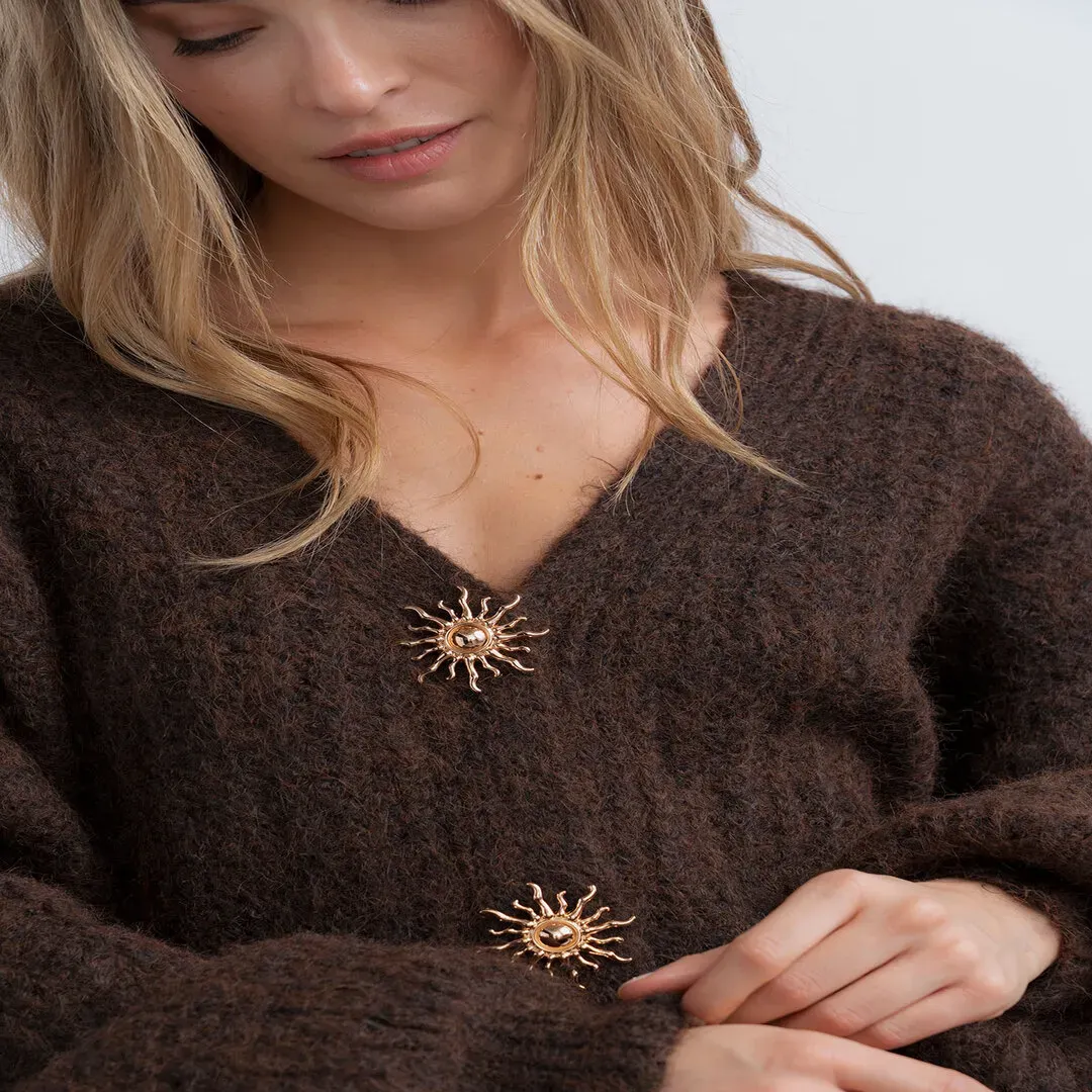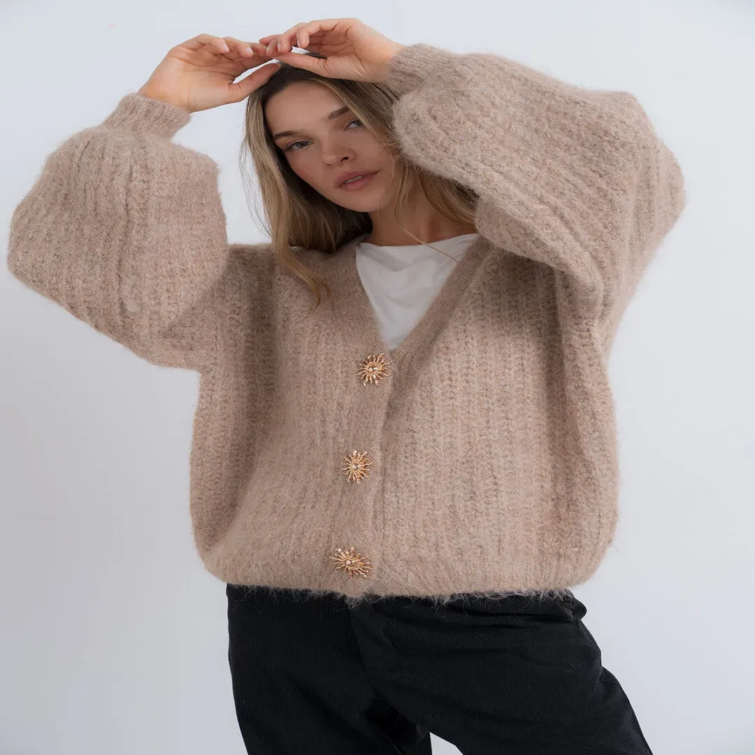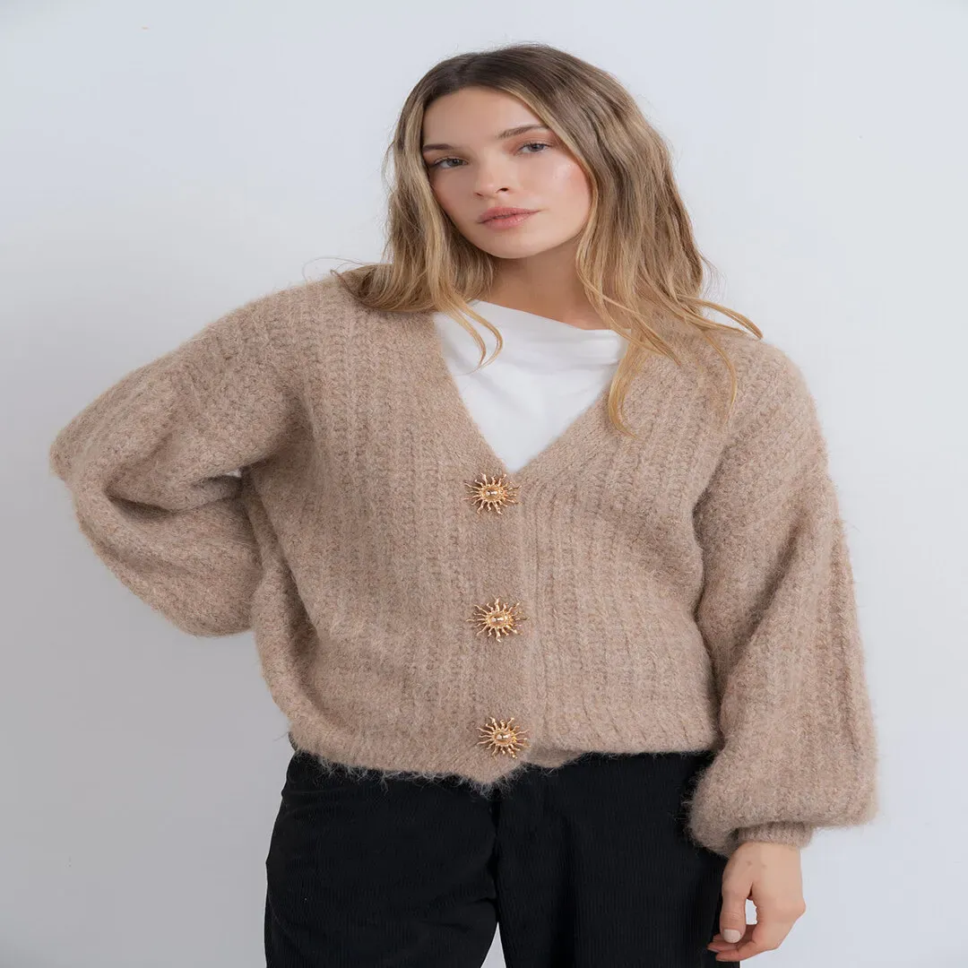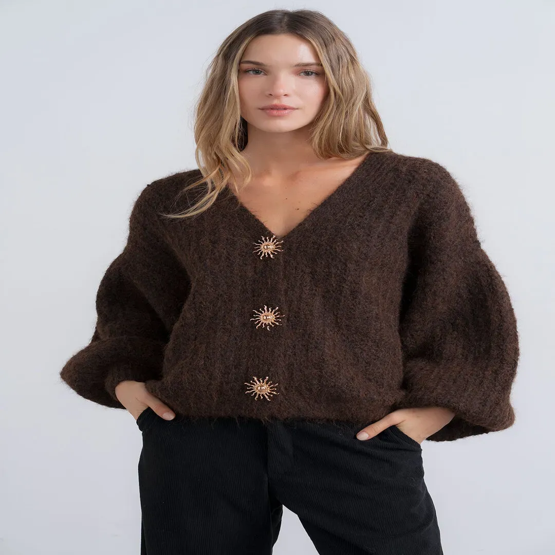 Sweater cardigan tejido con lana super suave, pelo largo, con botones dorados y mangas amplias.