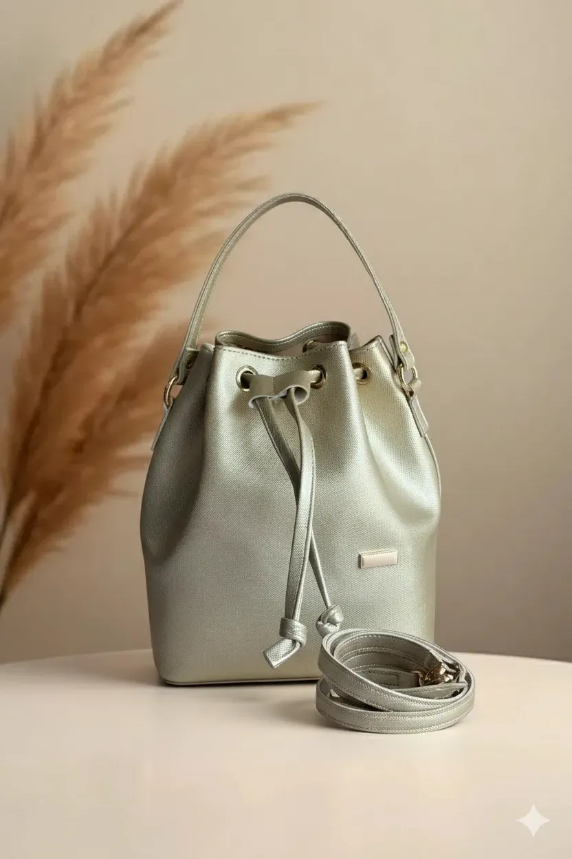 El bolso es de estilo bucket bag (o tipo saco), caracterizado por su diseño estructurado pero flexible y un aire sofisticado.
